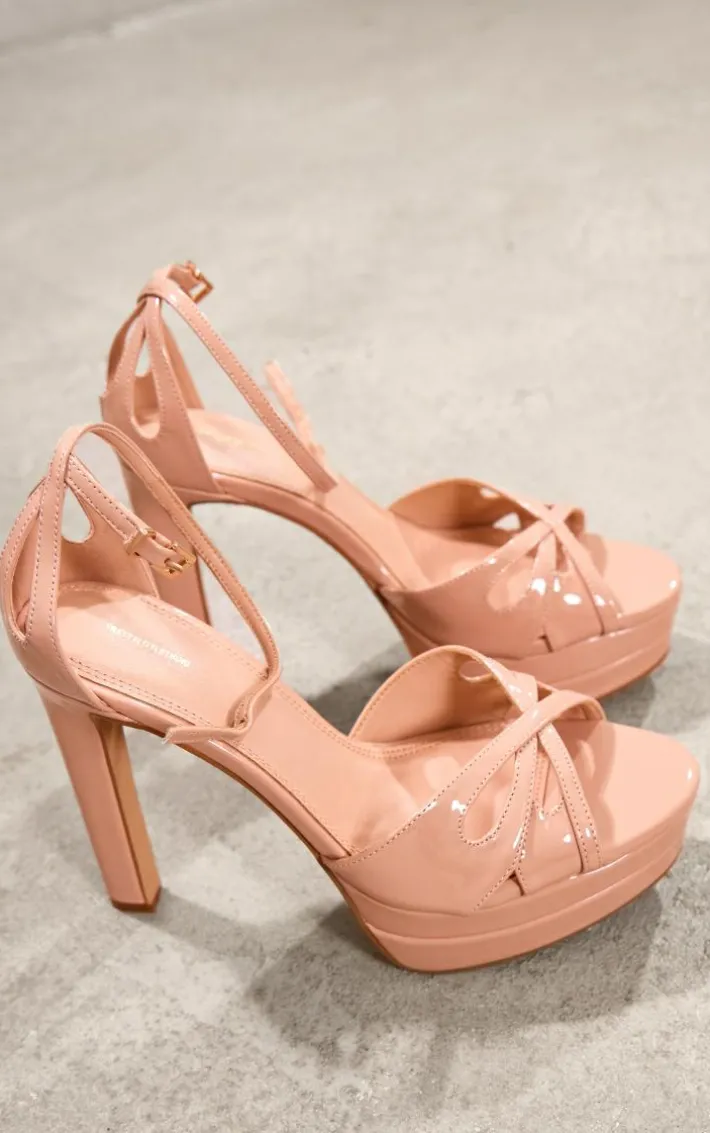Step out in style with these nude patent cut out strap double platform high heeled sandals. Brought to you in a nude patent material with a cut out strap and a double platform design, you are sure to make a statement with these high heeled sandals. Team with your fave accessories and go-to outfit to turn heads for all the right reasons.