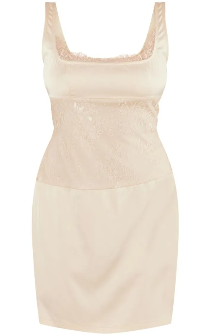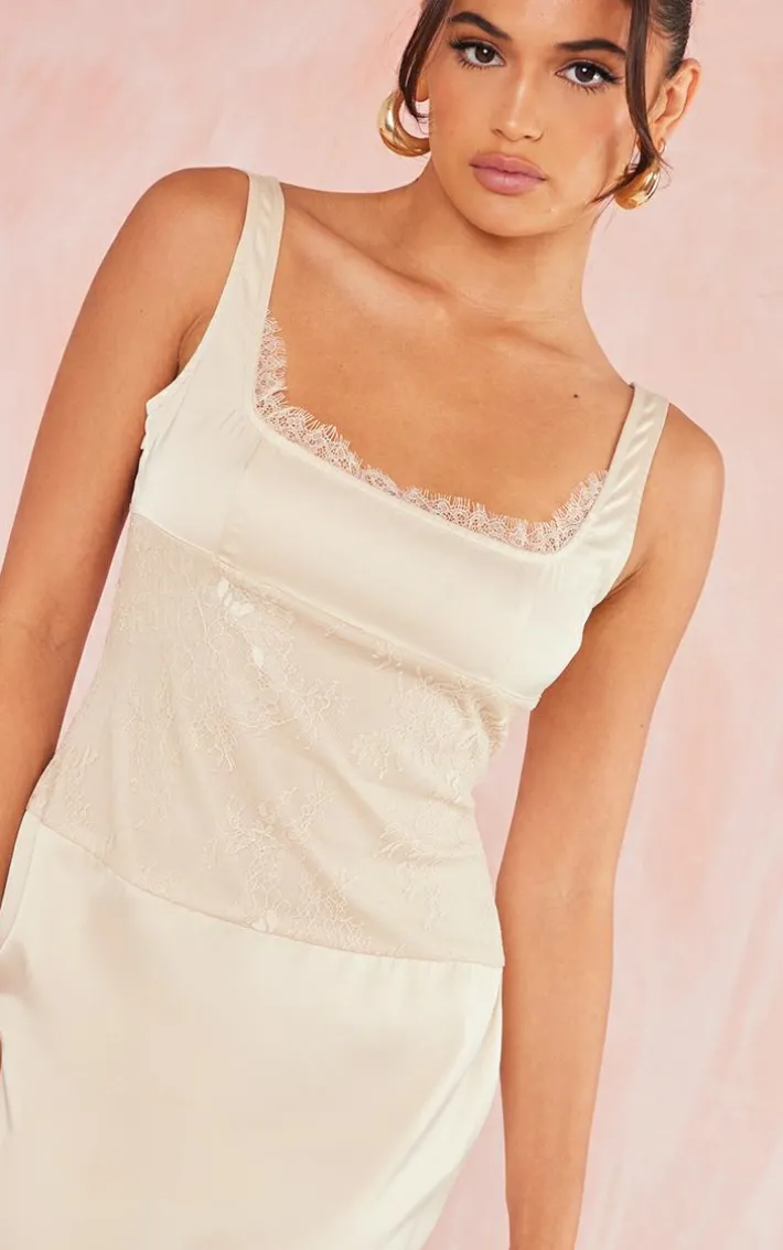 Be the center of attention in this nude satin lace insert trim detail strappy bodycon dress. This dress is brought to you in a nude satin material with a lace trim detail that will have you feeling effortlessly chic this season. With its strappy design and bodycon fit, you will be showing off your shape in all the right places. Simply style with a pair of strappy heels and your go-to gold hoops to finish off the look everyone is talking about.