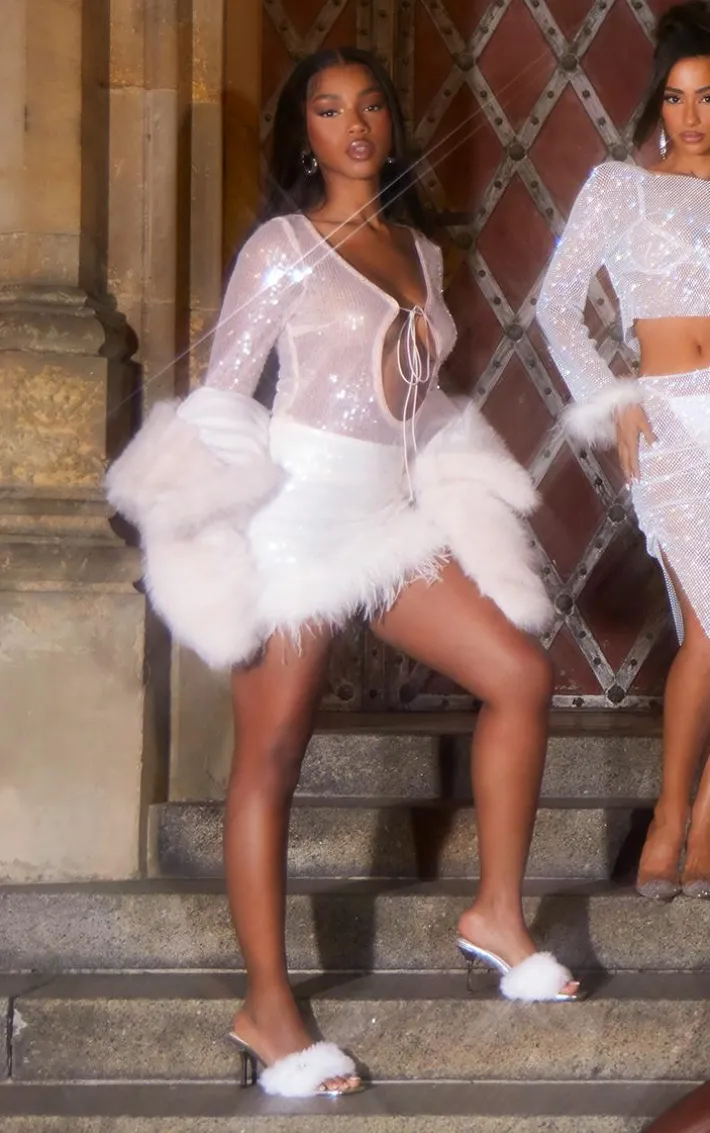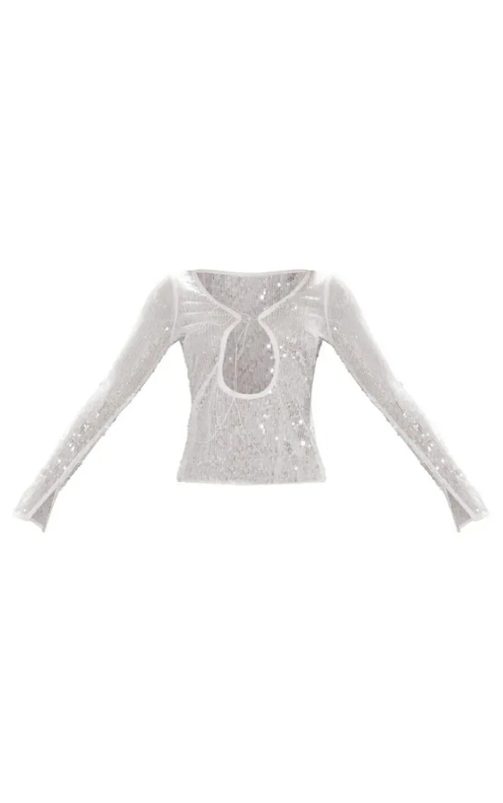 Be prepared to be the center of attention this weekend with this nude sheer sequin plunge tie front cut out long sleeve long top. Made from a nude sheer sequin material with a plunging neckline, a tie-front fastening and a cut-out design, it has everything you’ve been looking for and more. Perfect for nailing that glam dress code, this long top ticks all the boxes. Team with a mini skirt, platform heels and silver accessories for a statement finish.