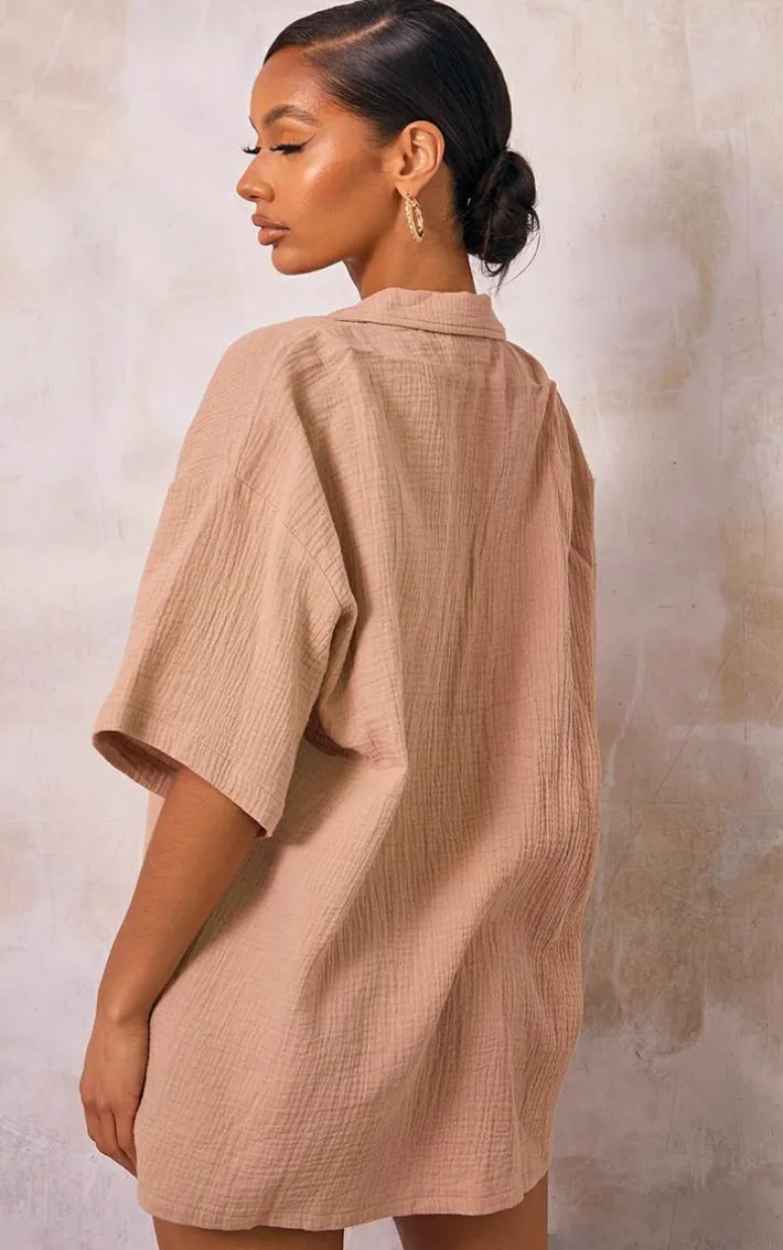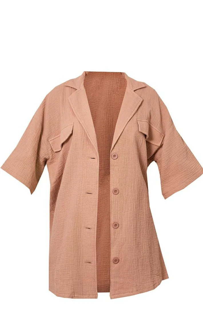 Switch up your look this season with this shirt. Featuring a nude woven material with shorts sleeves, pocket detailing and an oversized fit, what’s not to love? Wear with the matching floaty shorts, simple accessories and heeled mules for a date.