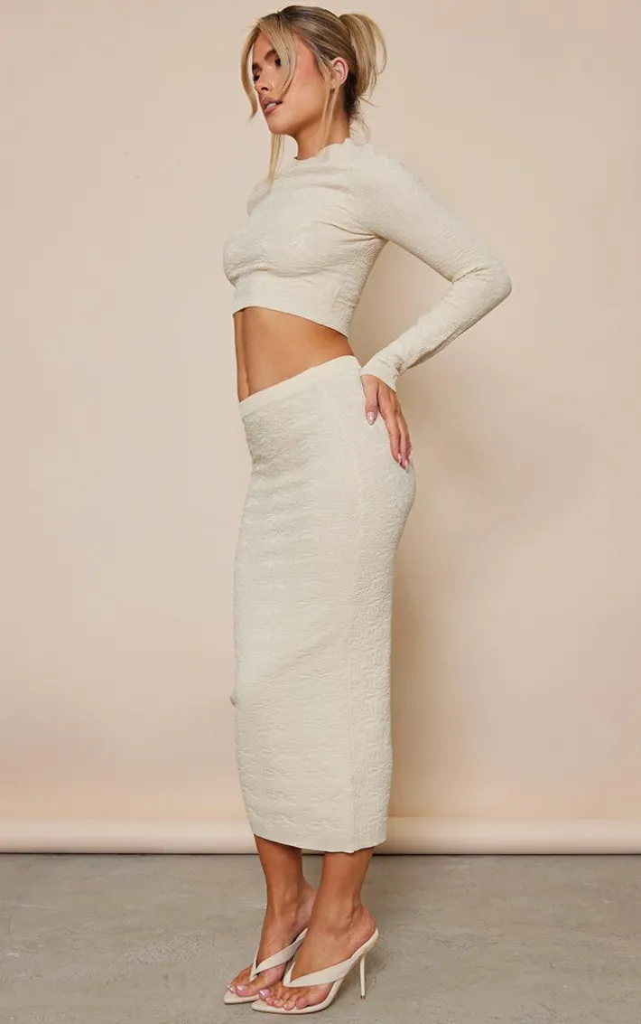 Have heads turning for the right reasons in this statement oatmeal flower embossed bodycon split skirt. This skirt is made from an oatmeal hue, perfect to add to your neutral wardrobe. With an embossed detail and a bodycon fit, what’s not to love ? Style with some chic heels, a cute bag and some gold hoops to take the look to the next level.