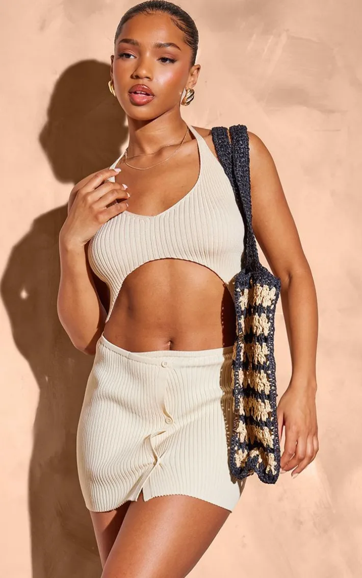 Bring all the neutral hues to your new season wardrobe with this oatmeal rib knit cut out halterneck top. Made from an oatmeal hue rib knit material with a halterneck design, how can you resist? Style this cut out top with the matching skirt and sandals for a look that is sure to have all eyes on you .
