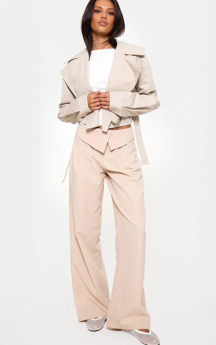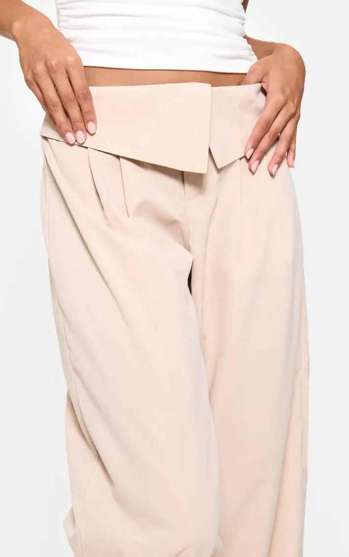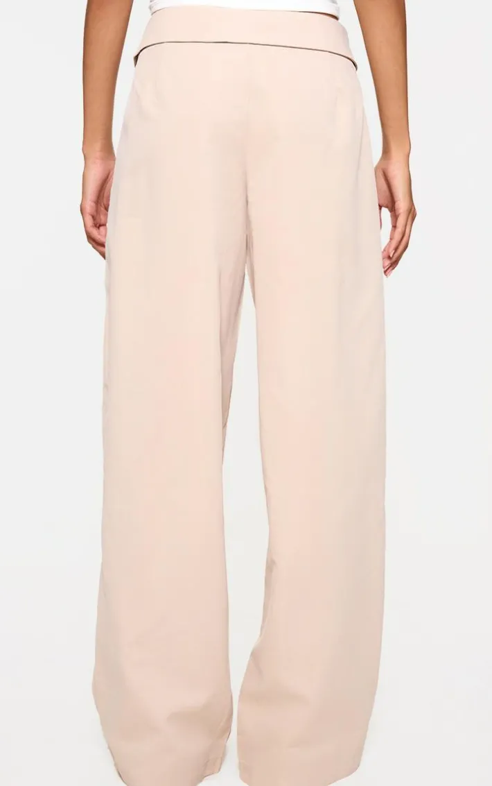 Amp up your neutral collection with these oatmeal turnover waistband detail wide leg tailored pants. Brought to you in an oatmeal material with a turnover waistband detail, these pants are the ultimate must have. These tailored pants have a wide leg fit that will have you setting trends no matter what. Team with a crop top and your fave accessories for a fool-proof finish.