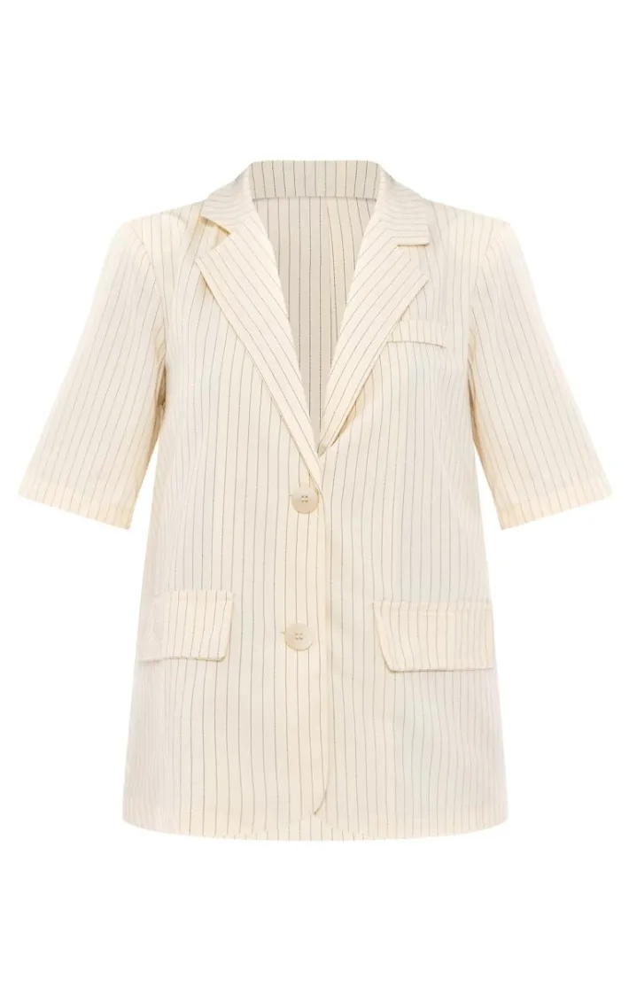 Get ready to earn some serious style points in this off white striped short sleeve oversized blazer. Brought to you in an off white hue material with a striped design, short sleeves and an oversized fit, how can you resist? Style this oversized blazer with jorts, sneakers and gold accessories for a look that is sure to nail new season trends.