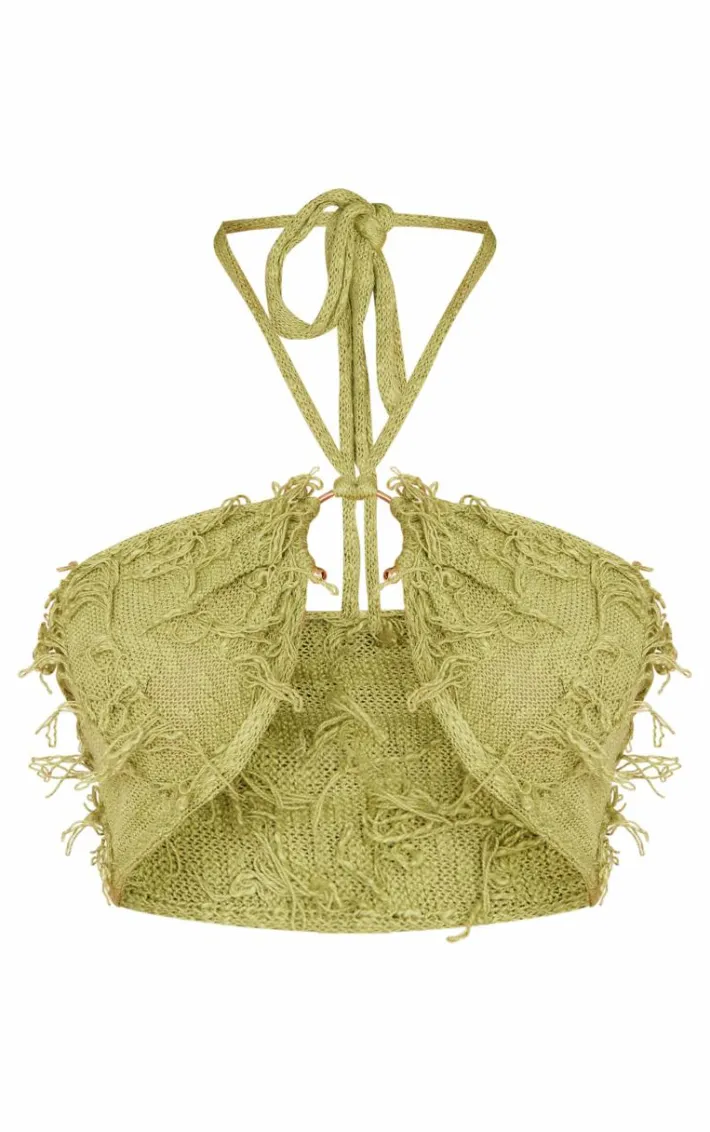 Take on your weekend the right way with this statement olive fringe knit trim detail halterneck crop top. Made from an olive knit material with a fringe trim detail and a halterneck fit, this is everything we’re loving and more. With its figure-hugging fit this crop top is sure to hug you in all the right places. To complete the look style this seamlessly with the matching skirt and your fave heels for a look that will secure you all the likes.
