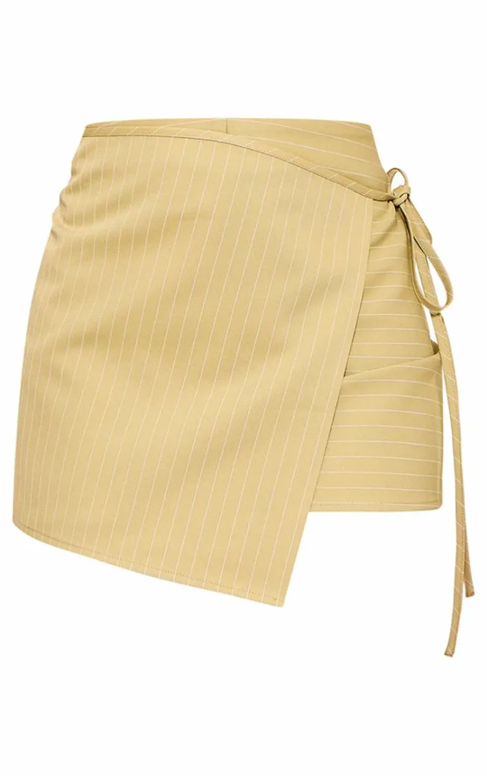 Dress to impress in this olive pinstripe woven tailored wrap over skirt Brought to you in an olive pinstripe woven material with a tailored fit and wrap over detail, this skirt is at the top of our wish list. We are seriously obsessed. Style with the matching pieces and white heels for a chic finish we can’t take our eyes off.