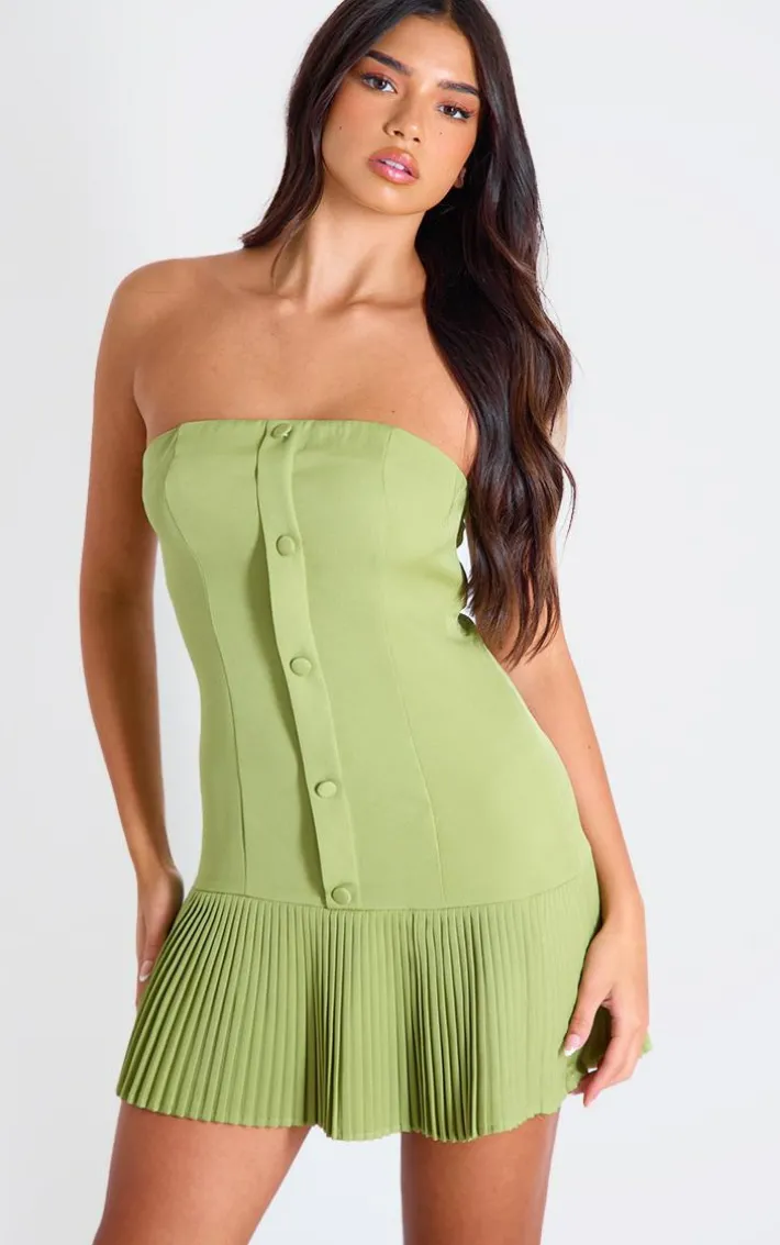 It’s official, we’re obsessed with this olive satin bandeau pleated shift dress. Brought to you in an olive hue satin material with a bandeau neckline and pleated skirt design, this shift dress is calling your name. Style with bow detail heels and a black mini bag for a chic finish we can’t take our eyes off. How can you resist?.