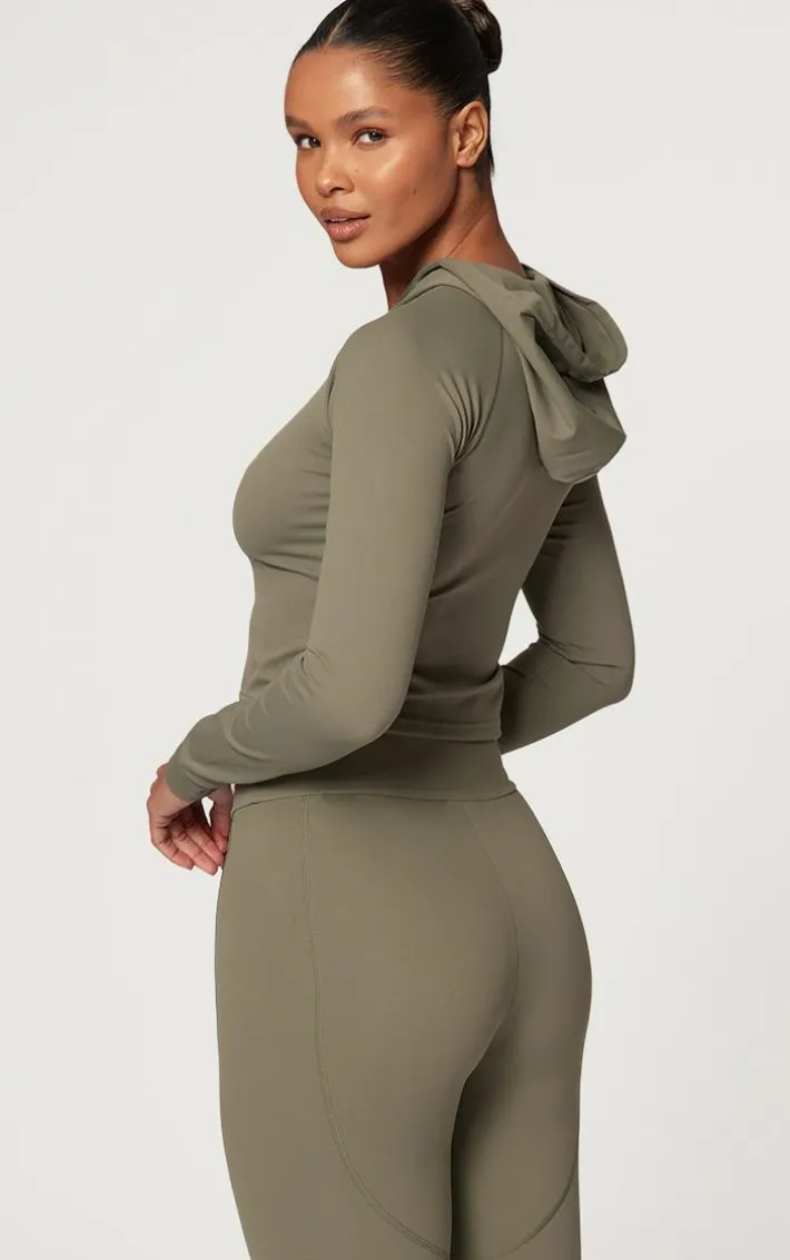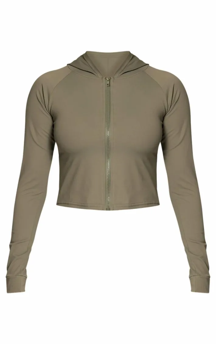 This olive sculpt hooded long sleeve gym jacket is perfect for your new season wardrobe. Made from an olive hue sculpt material with a hooded design and long sleeves, this gym jacket is a must have. How can you resist? Style with the matching leggings under a trench coat for a chic finish. Reach for this on every off duty day.