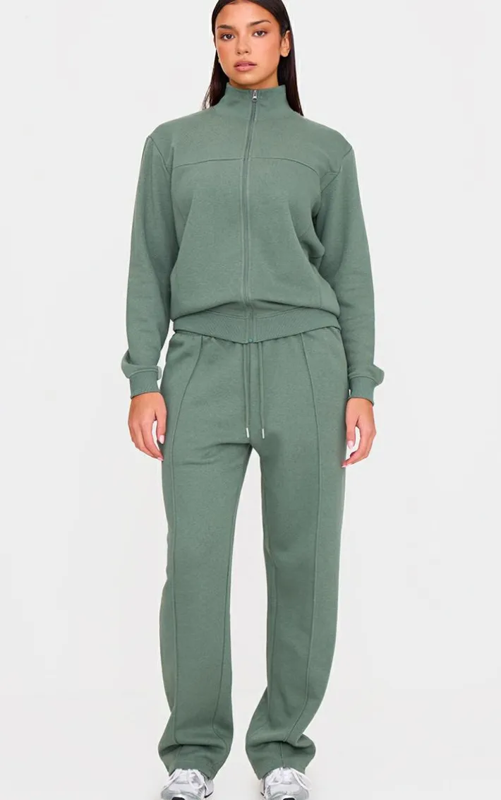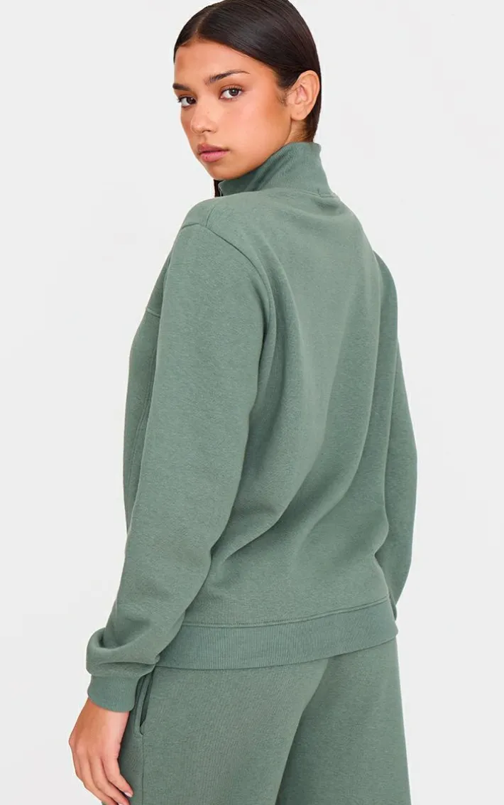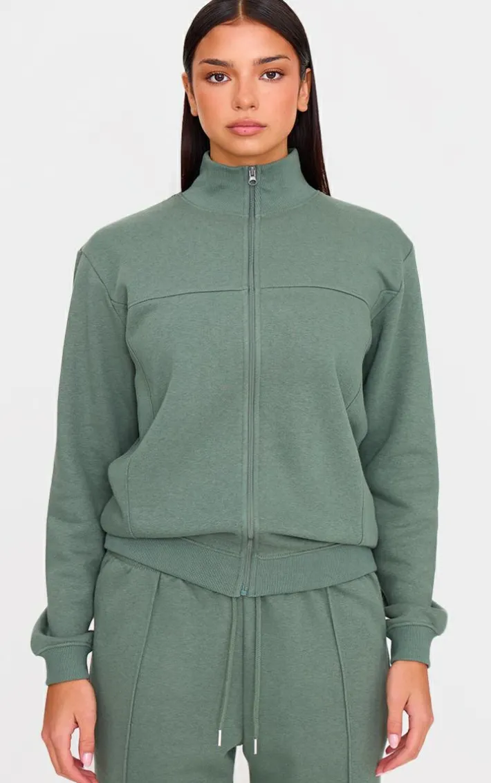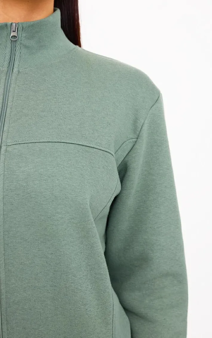 Keep it comfy with this olive seam detail zip through high neck Sweatshirt. Brought to you in an olive material with a seam detail and a zip through fastening, what more could you want? This Sweatshirt has a high neck fit, perfect for those on the go days. Style with the matching sweatpants and a pair of sneakers for a laid back look we are loving.