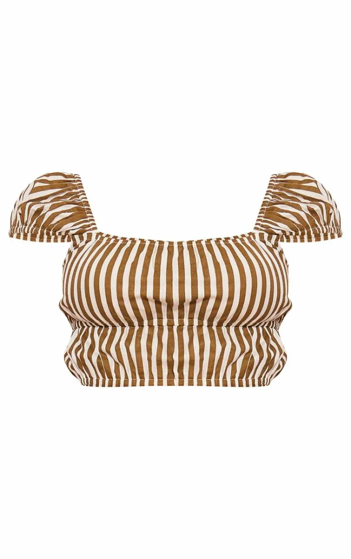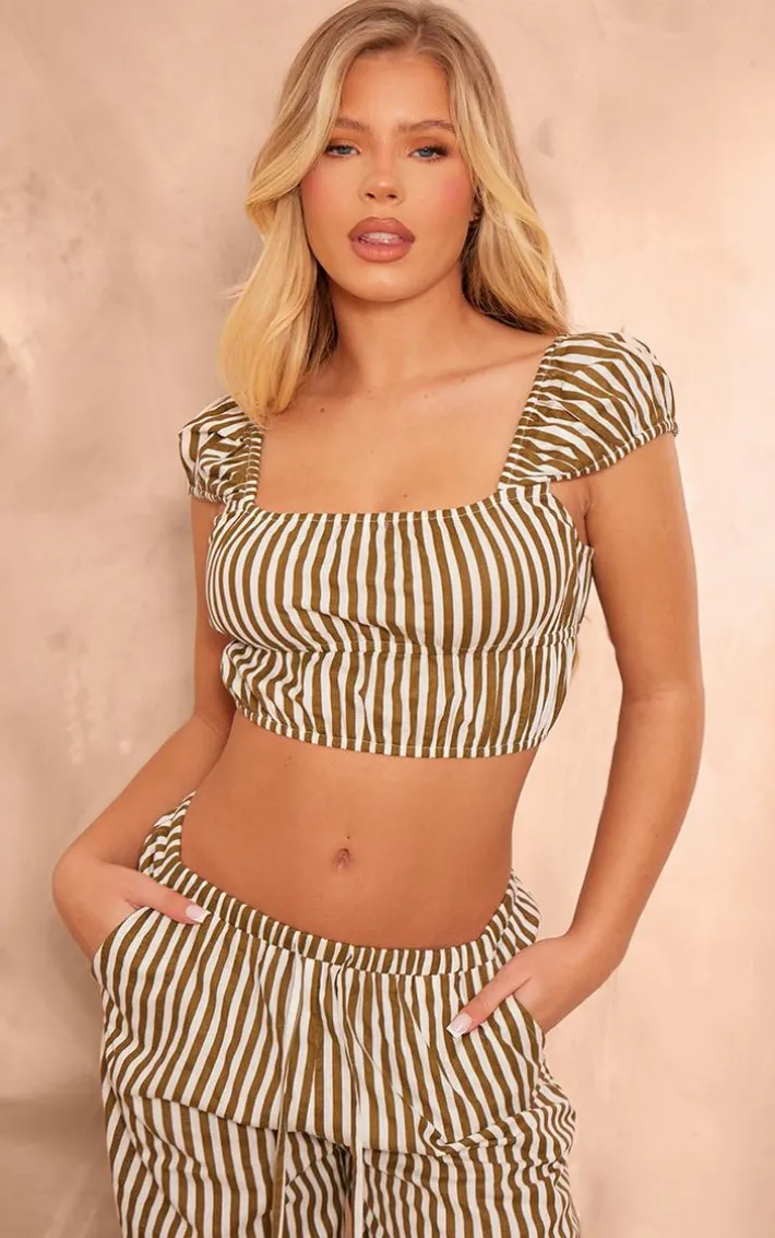 Turn heads in this olive striped linen look cap sleeve ruched crop top. Brought to you in an olive striped linen look material with a cap sleeve design and ruched detailing, how can you resist? Style this crop top with the matching bottoms, white flatforms and gold accessories for a look that won’t miss.