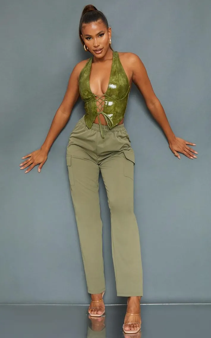 Got plans for the weekend ? Then this top is a must. Featuring an olive washed faux leather material with a lace-up front design and a halterneck fit. Pair this with matching hue bottoms and heels for a look we’re obsessing over.