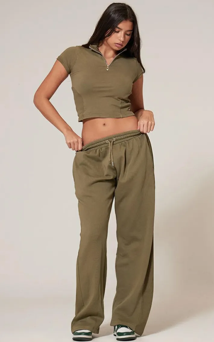 This olive washed zip up rib panel top is an autumnal staple. Whether you’re running errands or relaxing at home, its olive washed fabric, zip up detail and ribbed side panel design will keep you looking elevated. Match with the olive washed sweatpants, sneakers and your must-have accessories.