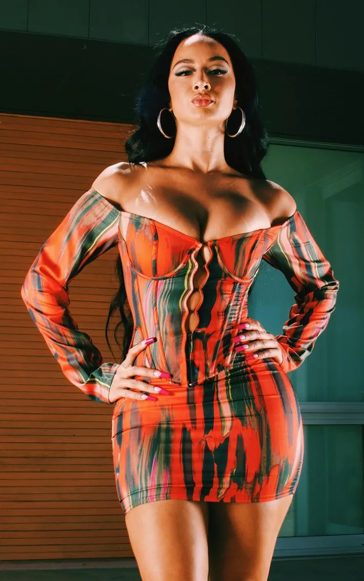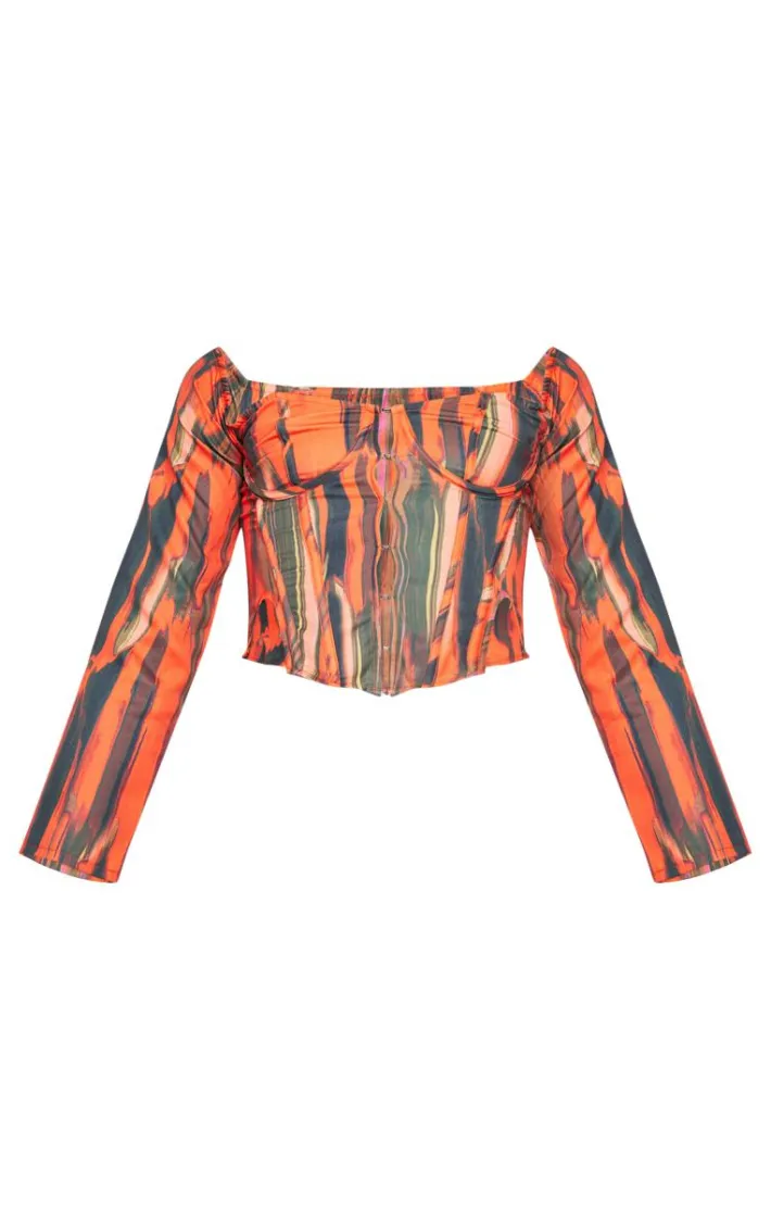 this corset top is a new season must-have. Featuring an orange material with an abstract print and flattering bardot neckline, what’s not to love? Wear with the matching skirt and lace-up heels to make them stop and stare.