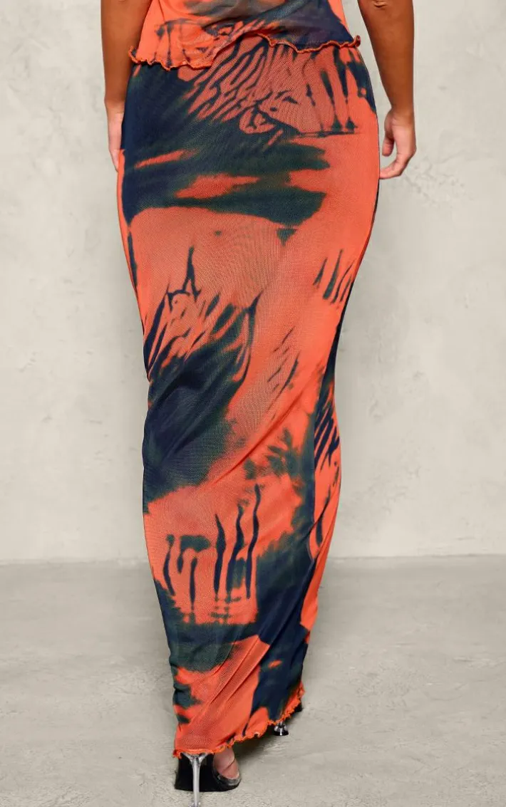 Add some statement prints into your weekend look with this orange abstract print mesh low rise maxi skirt. Brought to you in an orange hue mesh material with an abstract print design, a low rise fit and a flattering maxi length, how can you not be obsessed? Style this maxi skirt with the matching top, heels and gold accessories for a look that will have all eyes on you wherever you go.