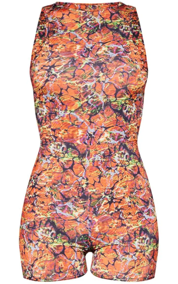 Add a pop of orange into your new season wardrobe with this orange abstract print racer neck romper. This romper is brought to you in an orange abstract print material with a racer neck and a figure-flattering fit, what’s not to love? With it’s statement hue you’re sure to have all eyes on you. Style this romper with chunky knee-high boots and accessories and a green mini bag for a look that we can’t get enough of.