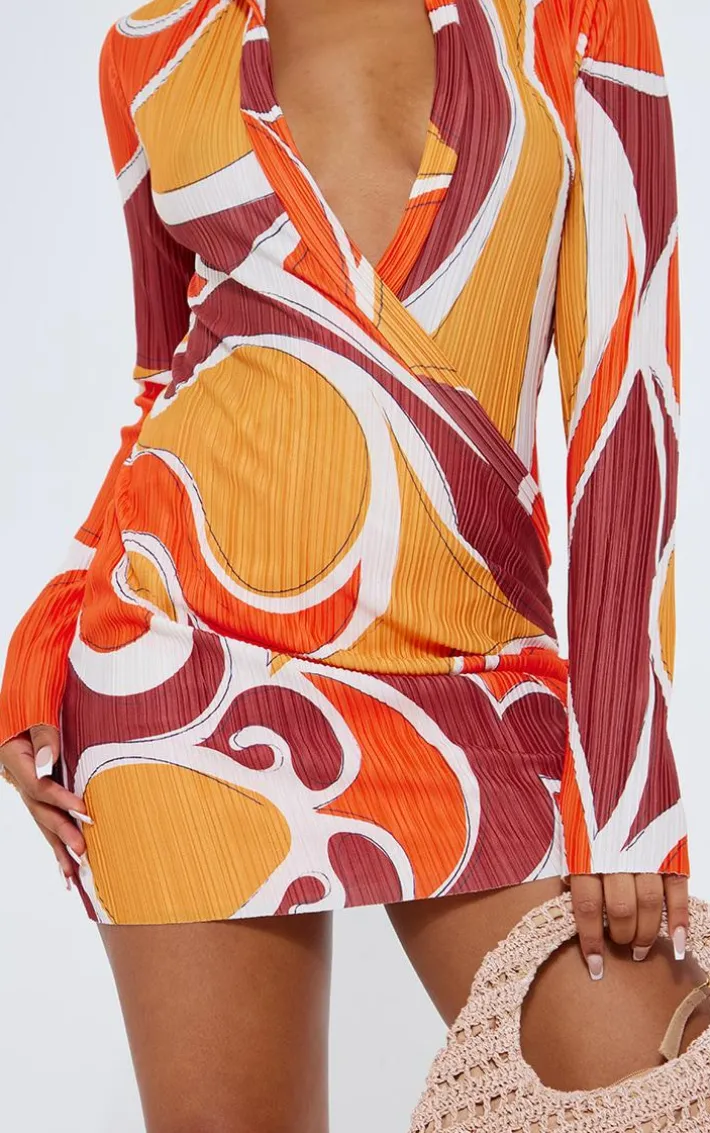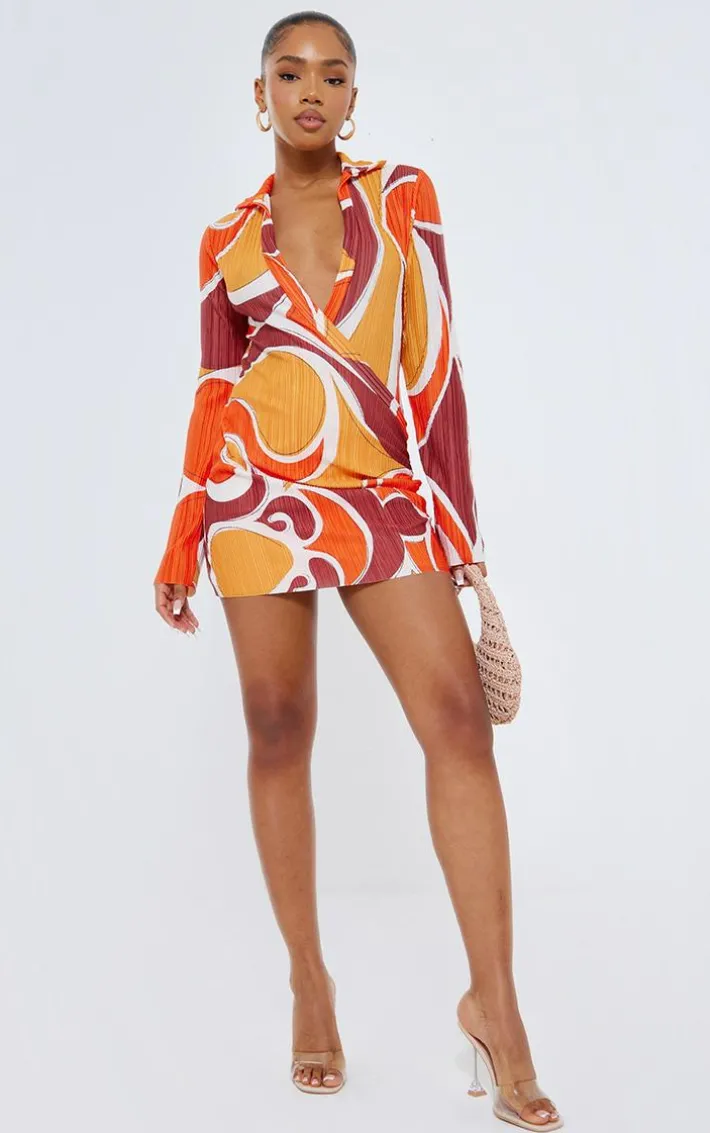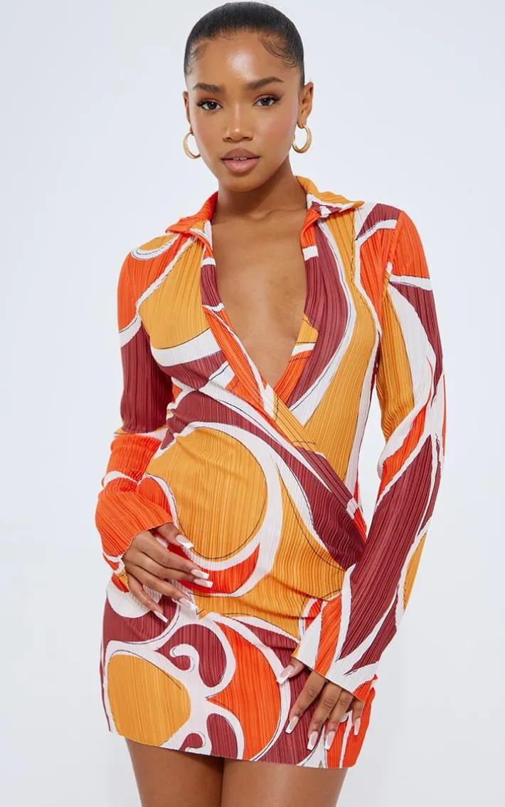 Catch everyone’s attention this weekend with this orange blurred print plisse plunge drape shirt dress. Made from an orange plisse material with a blurred print design, a plunging neckline, and a draped detail, how could you say no? This shirt dress is sure to make everyone stop and stare no matter what your plans are and we know you won’t be able to resist that. Simply add clear heels, gold accessories and a mini bag for a look that is sure to have all the eyes on you.