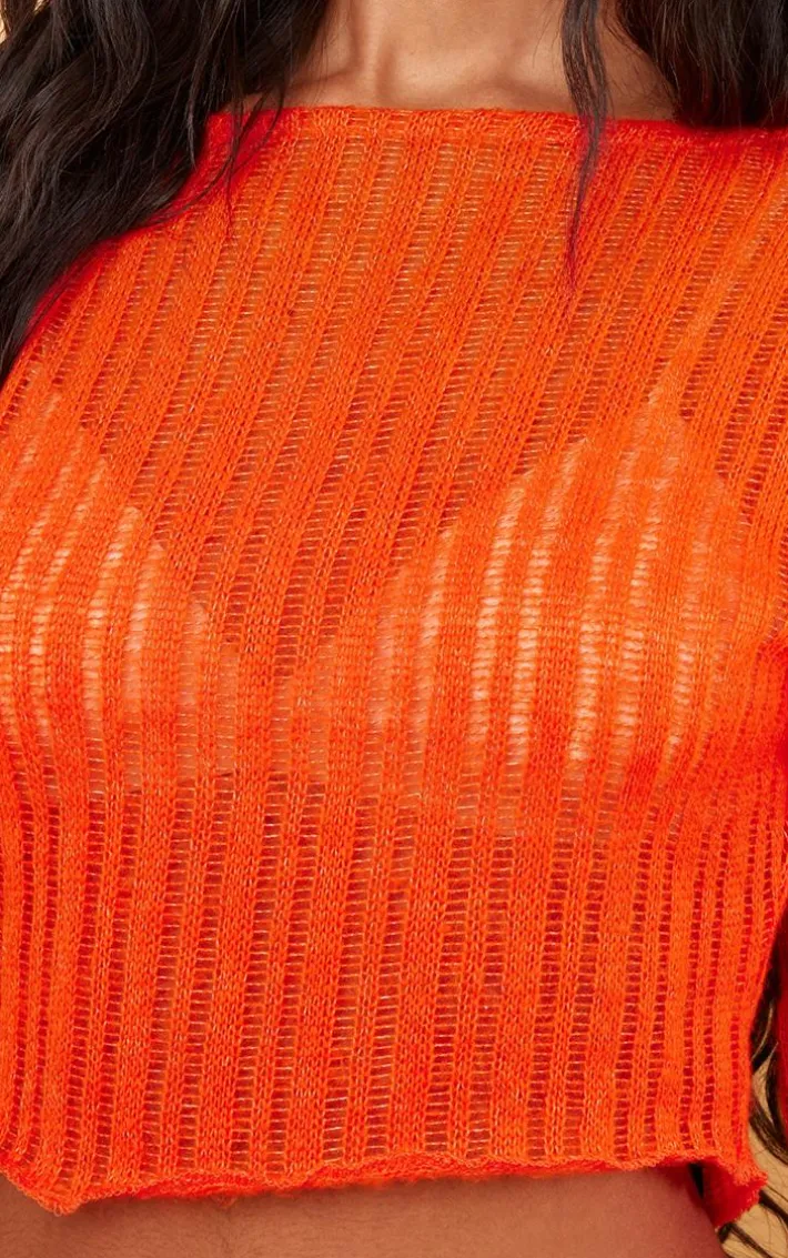 Add some statement hues into your look with this orange brushed stripe ladder oversized crop chuck on. This chuck on is brought to you in an orange brushed stripe ladder knit material with an oversized fit and a cropped length, what’s not to love? This chuck on is calling your name. Style this with white crochet bottoms, sandals and accessories for a vibe like no other.