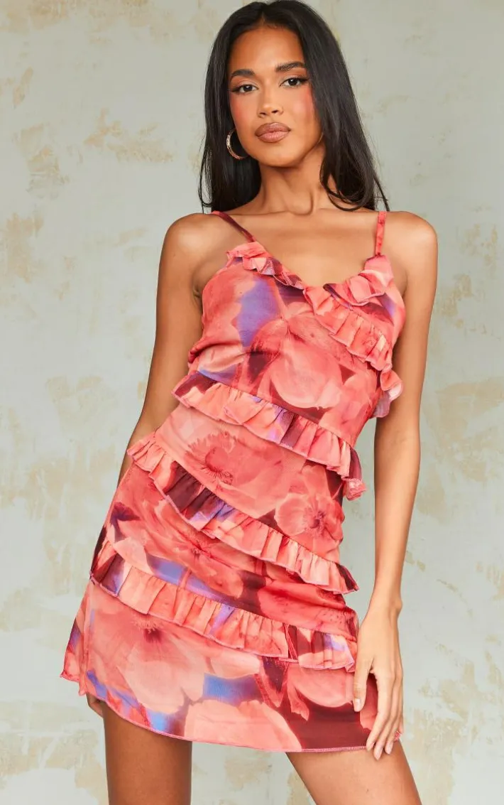 When your weekend look is calling for some dreamy floral prints, we’ve got you covered with this orange floral print asymmetric frill strappy shift dress. Brought to you in an orange material with a floral print design, asymmetric frill detailing and a floaty shift style, how can you not fall in love? Just add clear strap heels and gold accessories for a look that is sure to steal the stares.