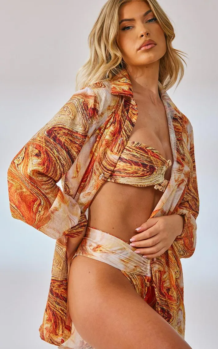 Turn up the heat on your vacay wardrobe with this orange marble print crinkle textured oversized shirt. It is the perfect piece for showing off your confident side on those poolside days. This shirt is made with an orange crinkle textured material with a marble print design and an oversized fit, what’s not to love? Simply add the matching pants, bikini and your fave accessories for a look that is sure to have all eyes on you.