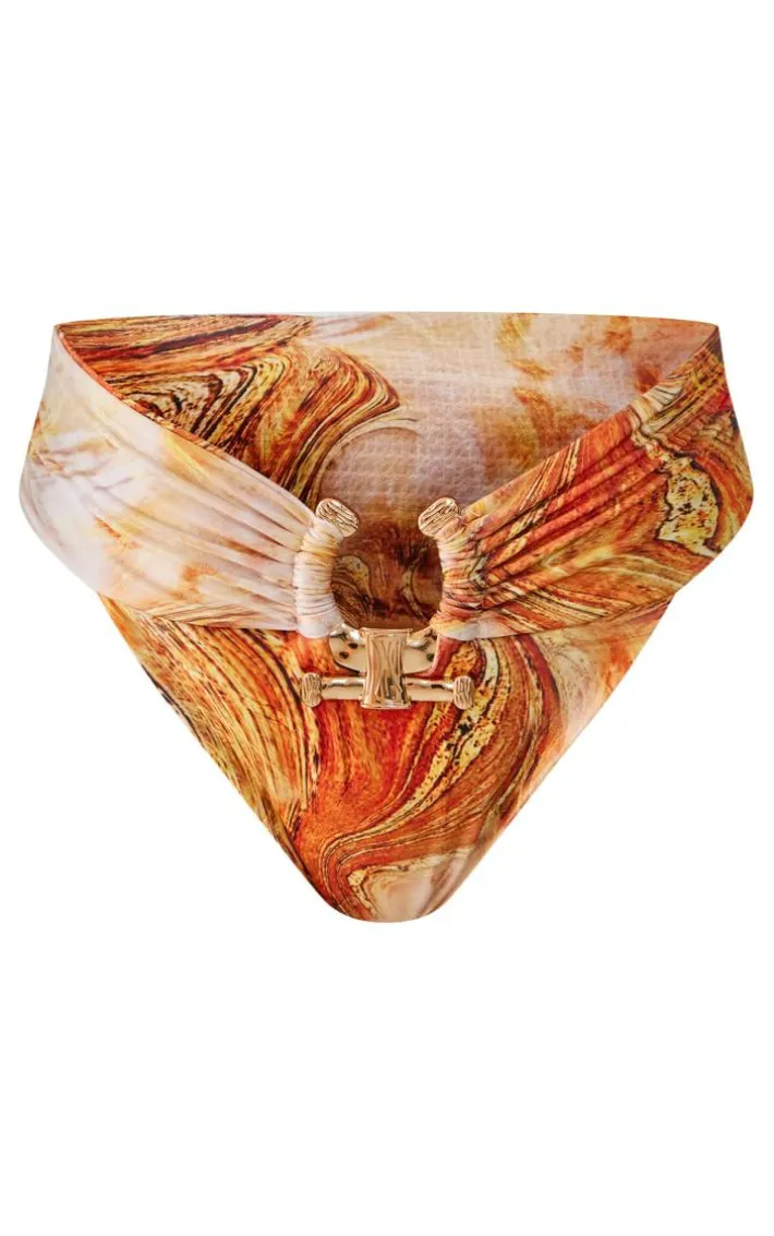 Inject some statement prints into your vacay wardrobe with these orange print hammered trim bikini bottoms. Brought to you in an orange hue material with a printed design and hammered trim detailing for that subtle touch of glam, we are obsessed. Pair these bikini bottoms with the matching bikini top and statement accessories for a poolside look that is sure to turn heads.