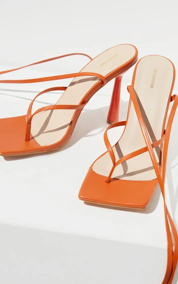 Add a bold pop to your look with these heels. Featuring an orange PU material with a toe thong design tie up straps and a circle heel, we are obsessed. They’re perfect for styling with your weekend wardrobe pieces.