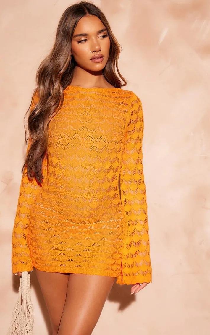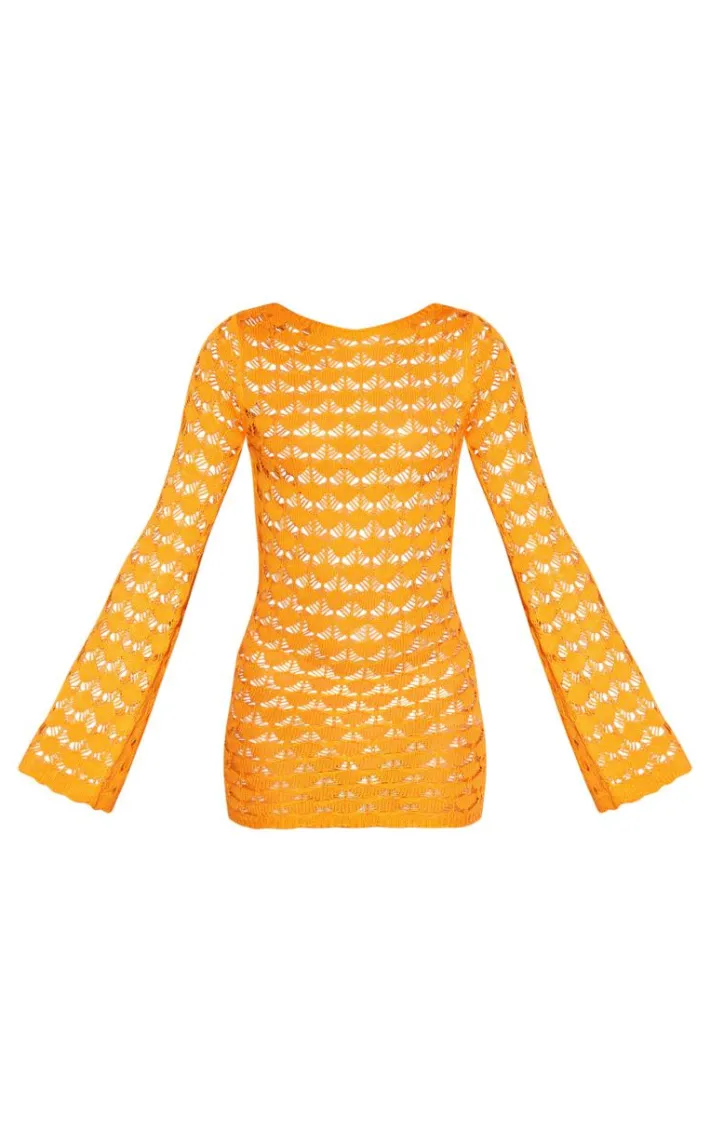 Get vacay ready with this orange shell knit low back mini dress. Brought to you in an orange shell knit material with a low back design, this mini dress is all the new you need. Style with flats and a crochet beach bag full of all the essentials to get your tan on.