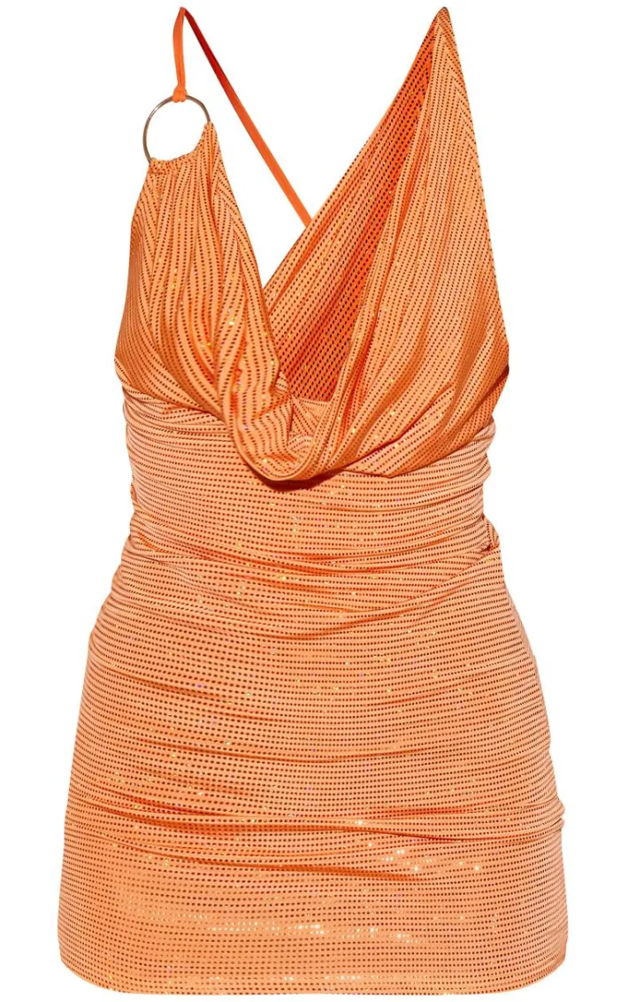 Make heads turn for all the right reasons in this orange textured glitter ring detail cowl neck bodycon dress. Brought to you in an orange hue textured glitter material with a cowl neck design, ring detailing and a flattering bodycon fit, how can you not be obsessed? Style this bodycon dress with heels and accessories for a look that will bring all the dram to your weekend plans.