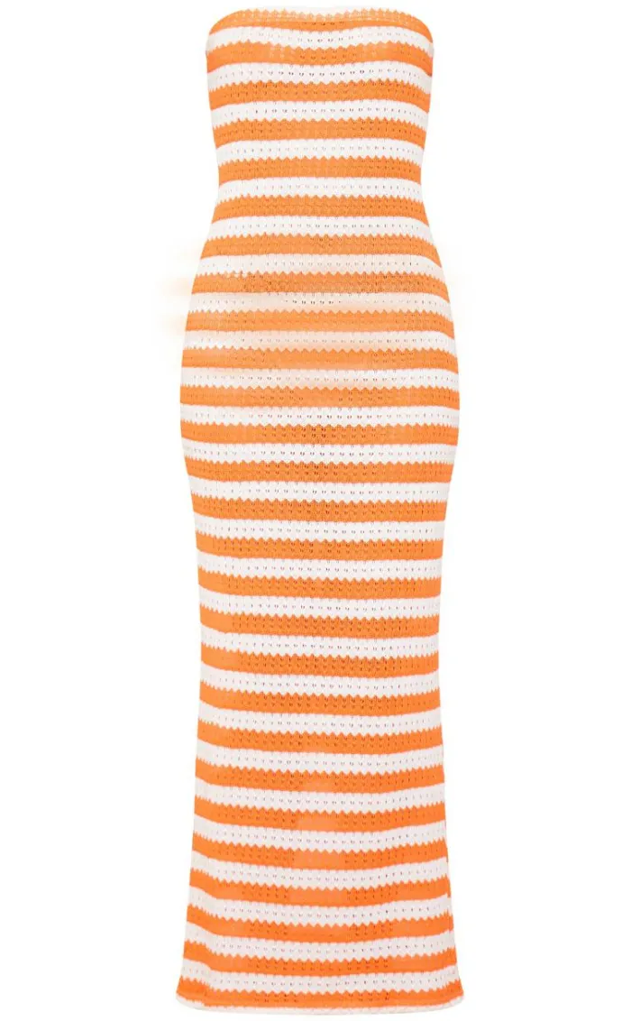 Enter the new season in style with this orange textured stripe bandeau midaxi dress. Brought to you in an orange hue textured material with a striped design, a bandeau neckline and a figure-flattering midaxi fit, how can you say no? Style this bandeau dress with sandals and gold accessories for a look you will be reaching for again and again.