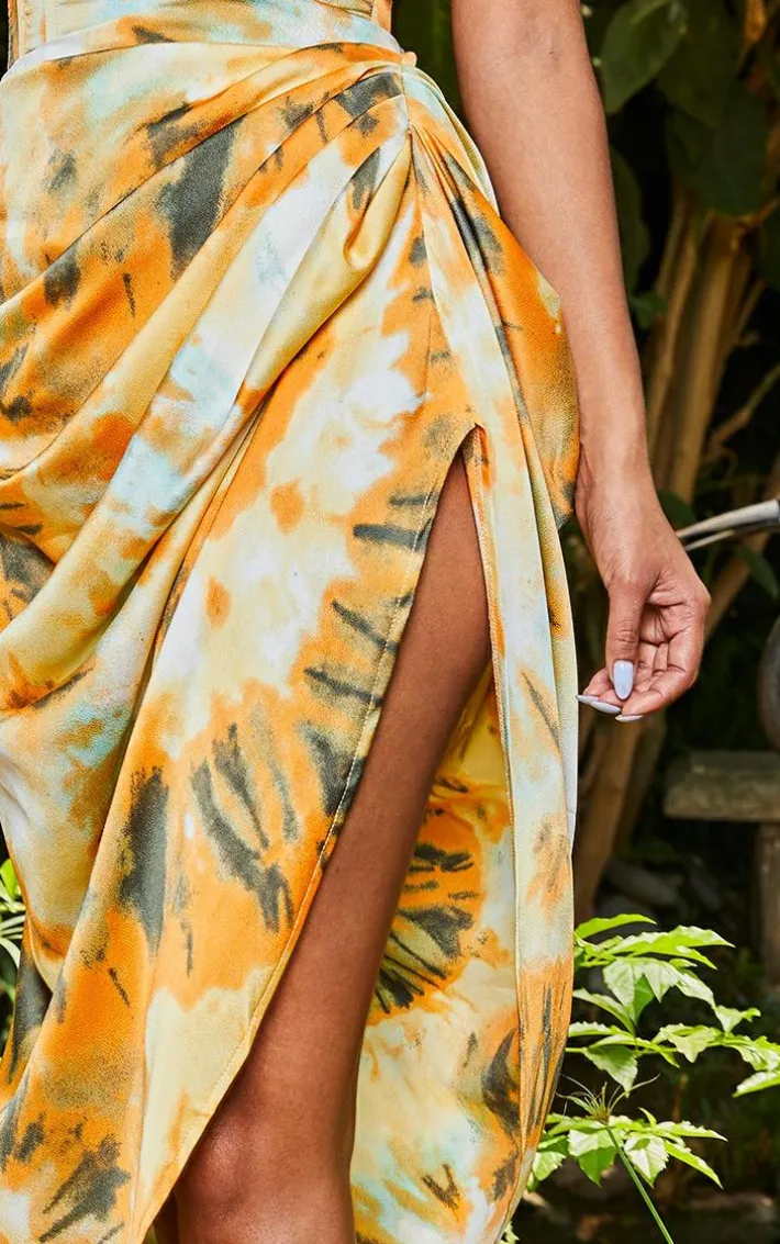Got a special occasion coming up and looking for a seriously chic ‘fit? This ruched midi skirt is sure to take your look to a whole new level. Featuring an orange material with a tie dye design, ruched side detail and a midi length, what more could you want? We are loving this tie dye skirt styled with the matching top, heels and statement accessories for a look that will have eyes on you for all the right reasons.