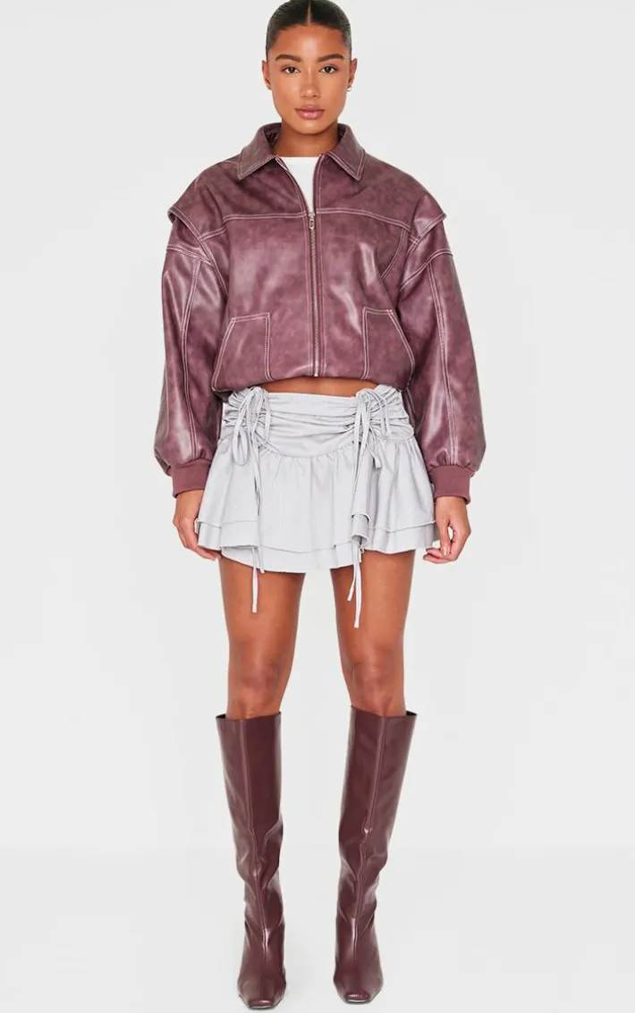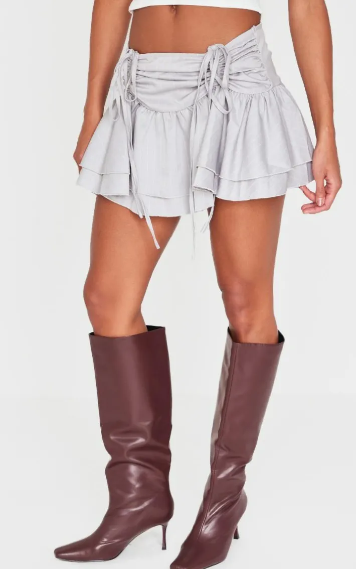 Amp up your style game with this pale grey pinstripe woven ruched front peplum mini skirt. Brought to you in a pale grey pinstripe woven material with a ruched front and peplum design, this mini skirt is calling your name. Style with a a shirt, court heels and your fave accessories for a combo we’re crushing on.