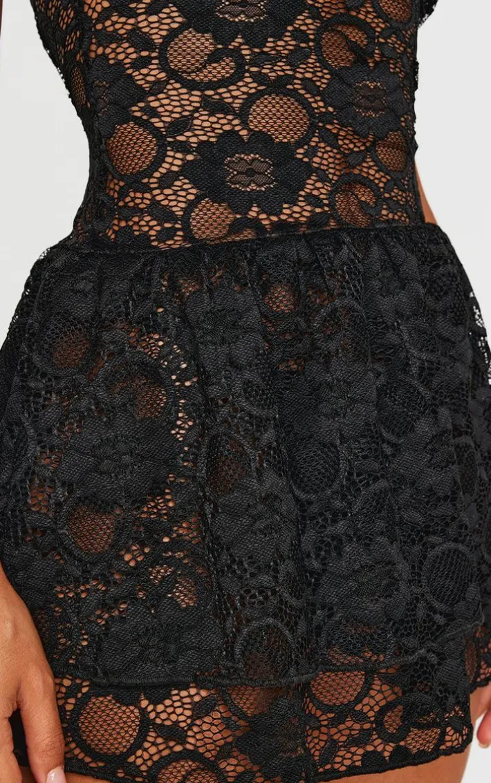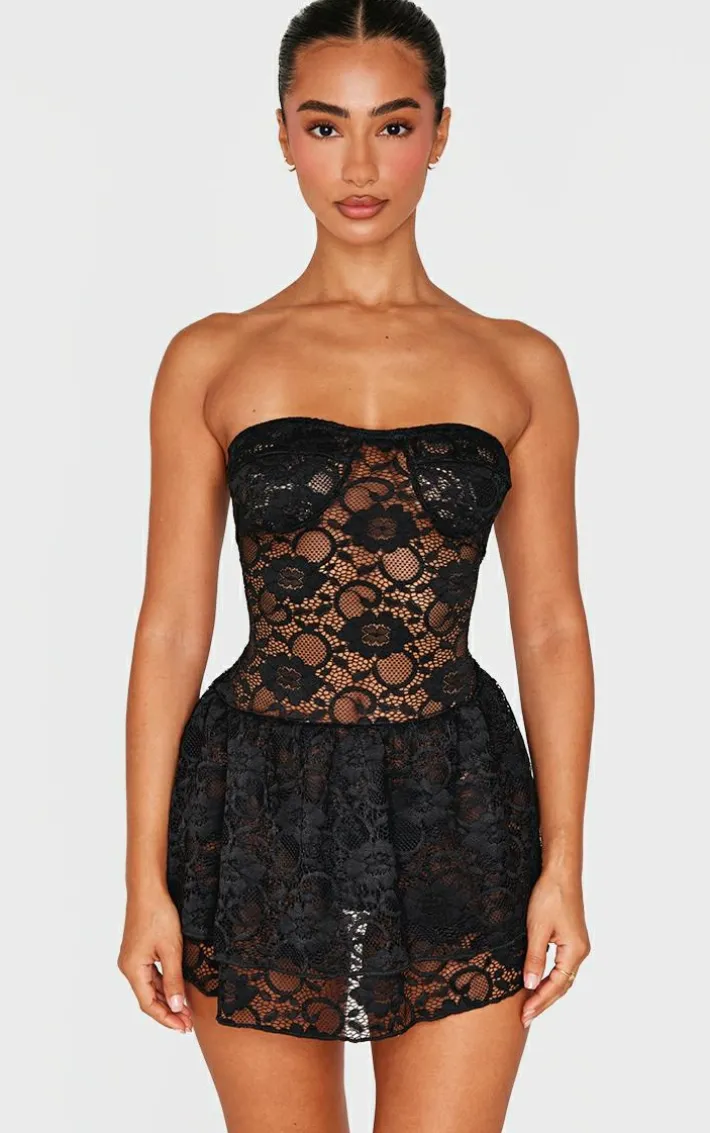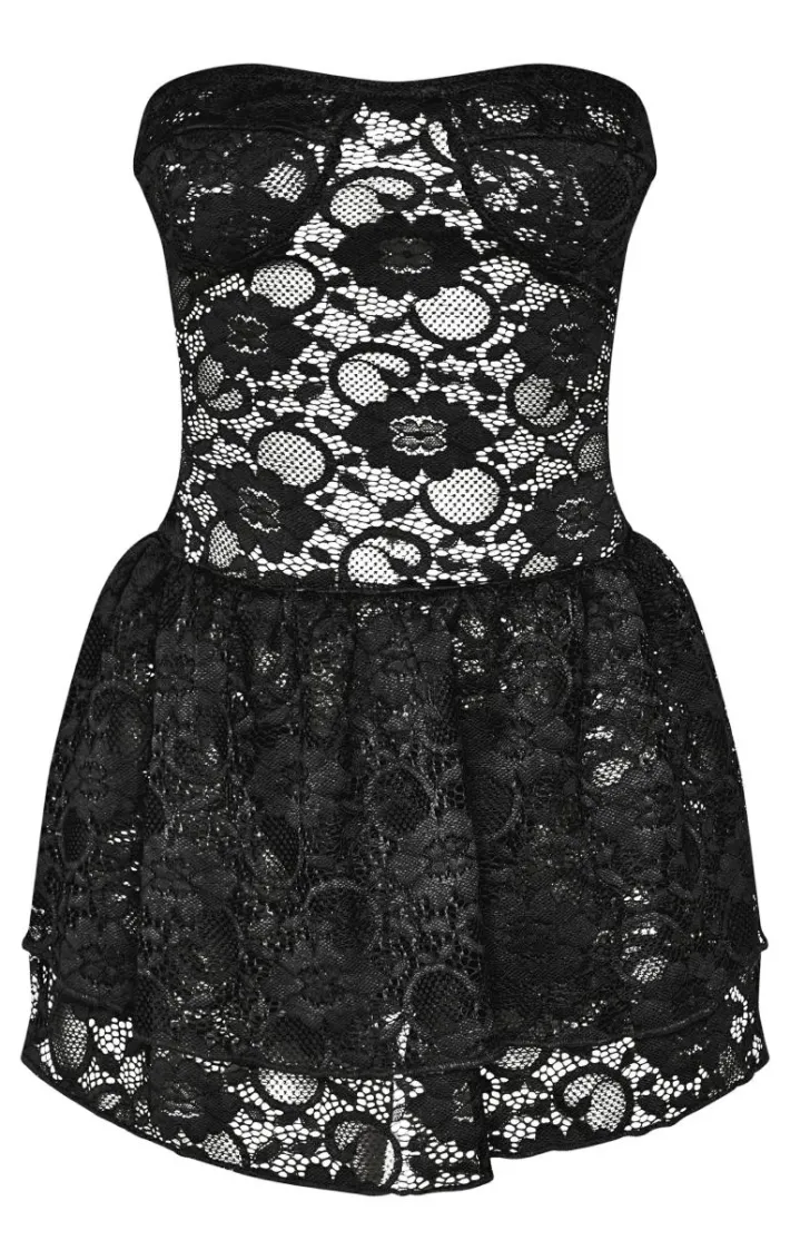Step out in style with this petite black bandeau lace ruffle mini dress. Brought to you in a chic black tone, with a flattering bandeau cut, lace material and ruffle design, this mini dress is calling your name. Team with a pair of heels and minimal accessories to finish off the look.