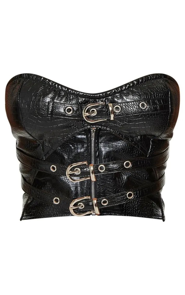 Pick up all those style credentials in this petite black belt detail croc faux leather bandeau top. You need its croc pattern material, fierce triple belt feature and bandeau top fit in your wardrobe this season. Add the matching mini skirt, strappy heels and a statement silver necklace to complete the look.