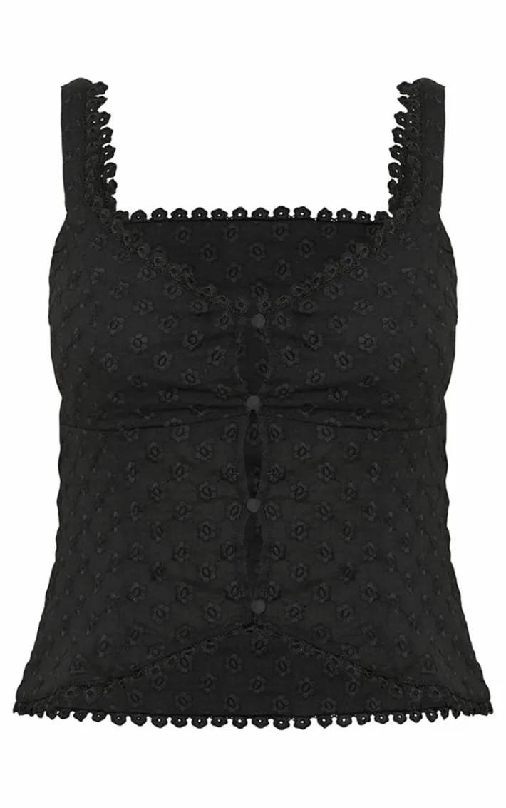When the weekend calls so does this petite black broderie trim detail fitted top. Brought to you in a black hue broderie material with a trim detail and fitted design, this top is a must-have. Style with the matching skirt, white heels and your fave accessories for a glam finish like no other.