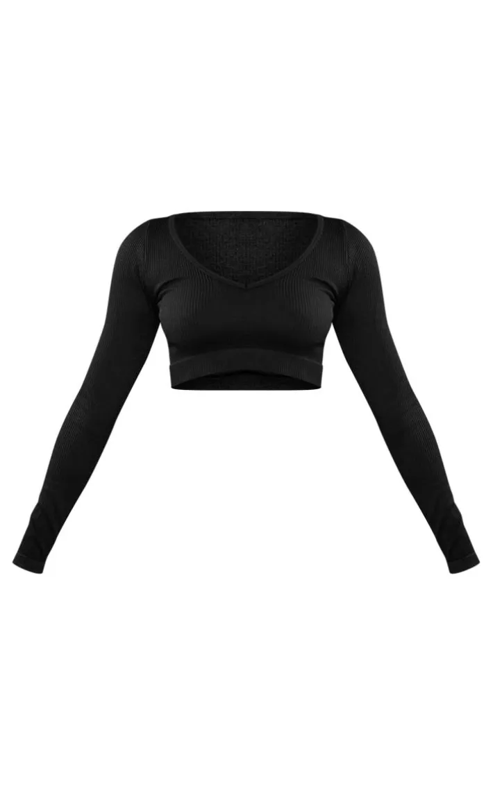 Get the ultimate sporty vibe with this crop top. Featuring a black ribbed material with a v-neck and long sleeves. Style with the matching leggings, fresh kicks, and blazer for the complete look.