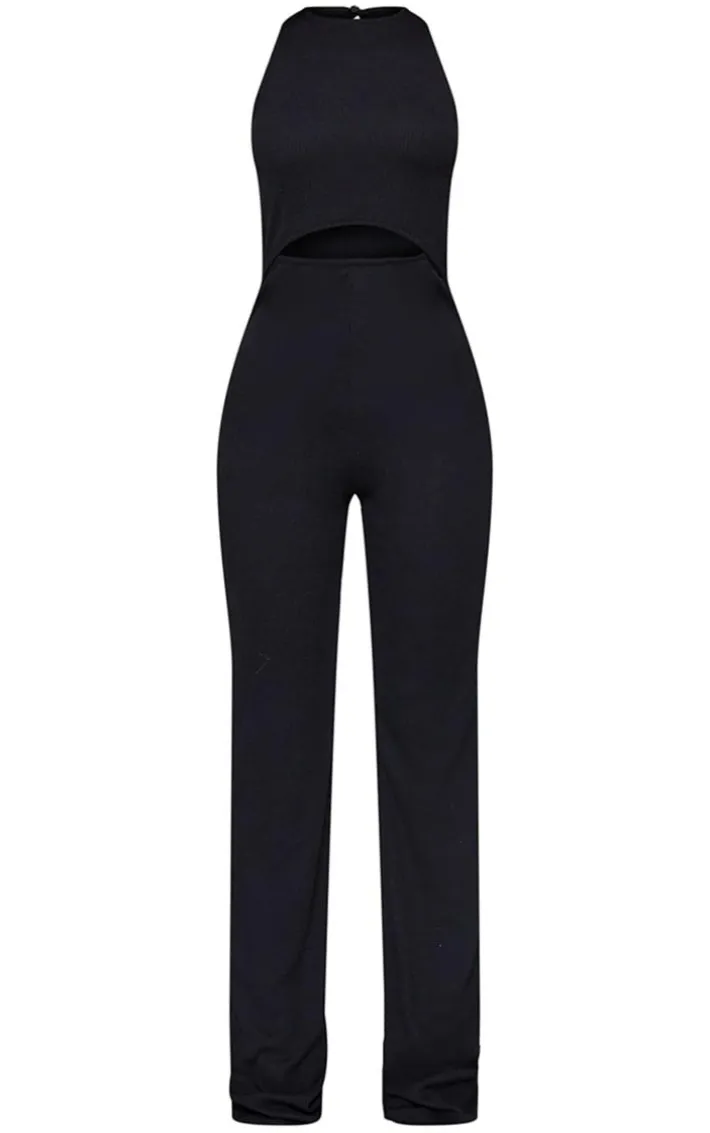 Never miss a beat with this statement jumpsuit. Featuring a black rib material with cutouts, a wide leg and a figure-flattering fit, we are in love. Team with high heels, accessories and a mini bag to complete the look.
