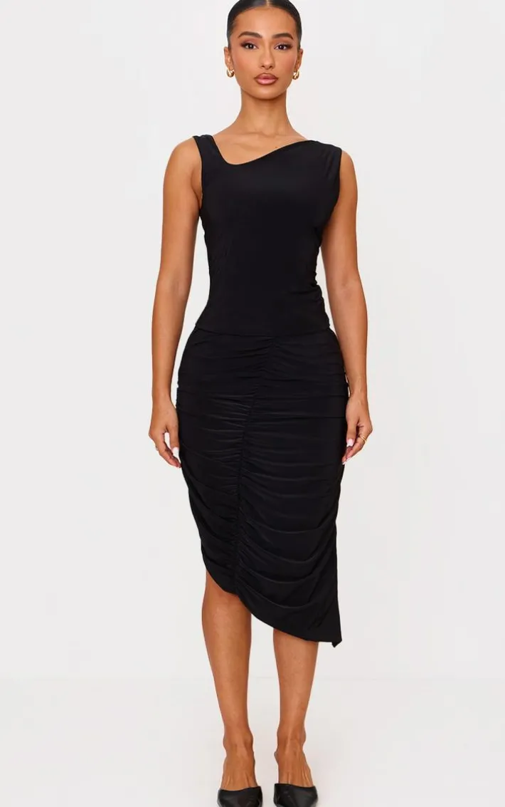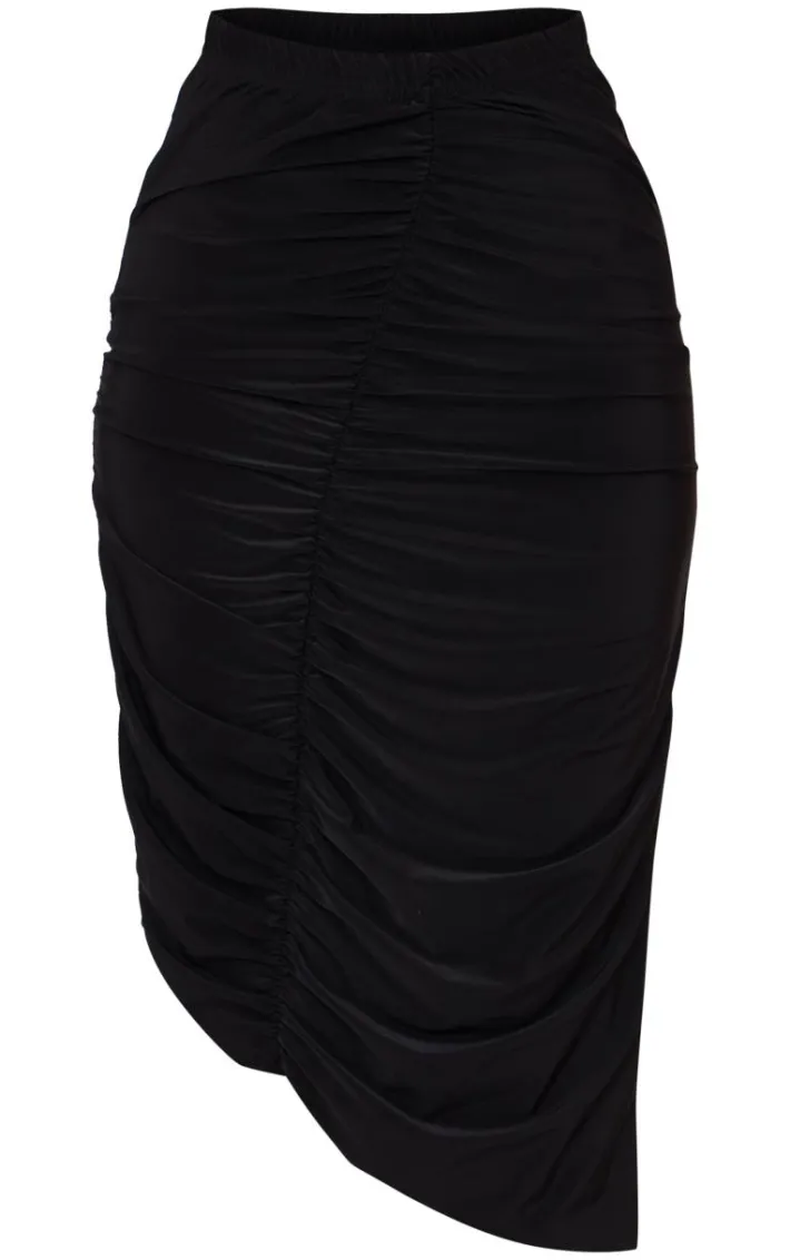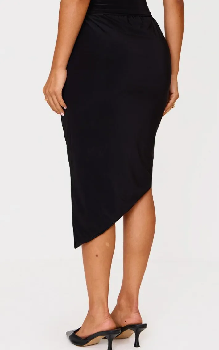 Elevate your style game with this petite black double slinky asymmetric midi skirt. Brought to you in a black hue double slinky material with an asymmetric hem, this midi skirt is all the new you need. Style with the matching top, slip on heels and simple accessories for a look we’re loving.