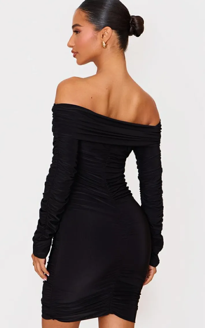 Take the stress out of weekend styling with this petite black double slinky bardot ruched mini dress. Brought to you in a black hue double slinky material with an bardot design and ruched detail, this mini dress is all the new you need. How can you resist? Style with knee high heeled boots and simple accessories for a look like no other.