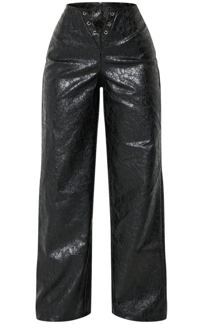 We can’t get enough of these petite black faux leather cracked effect lace up wide leg pants. Brought to you in a staple black shade, with a luxe faux leather material and cracked effect design, we’re in love. The lace up detailing and wide leg fit has us all hooked on these. Style with a black crop top, heels and your fave accessories for a look that won’t go unnoticed.