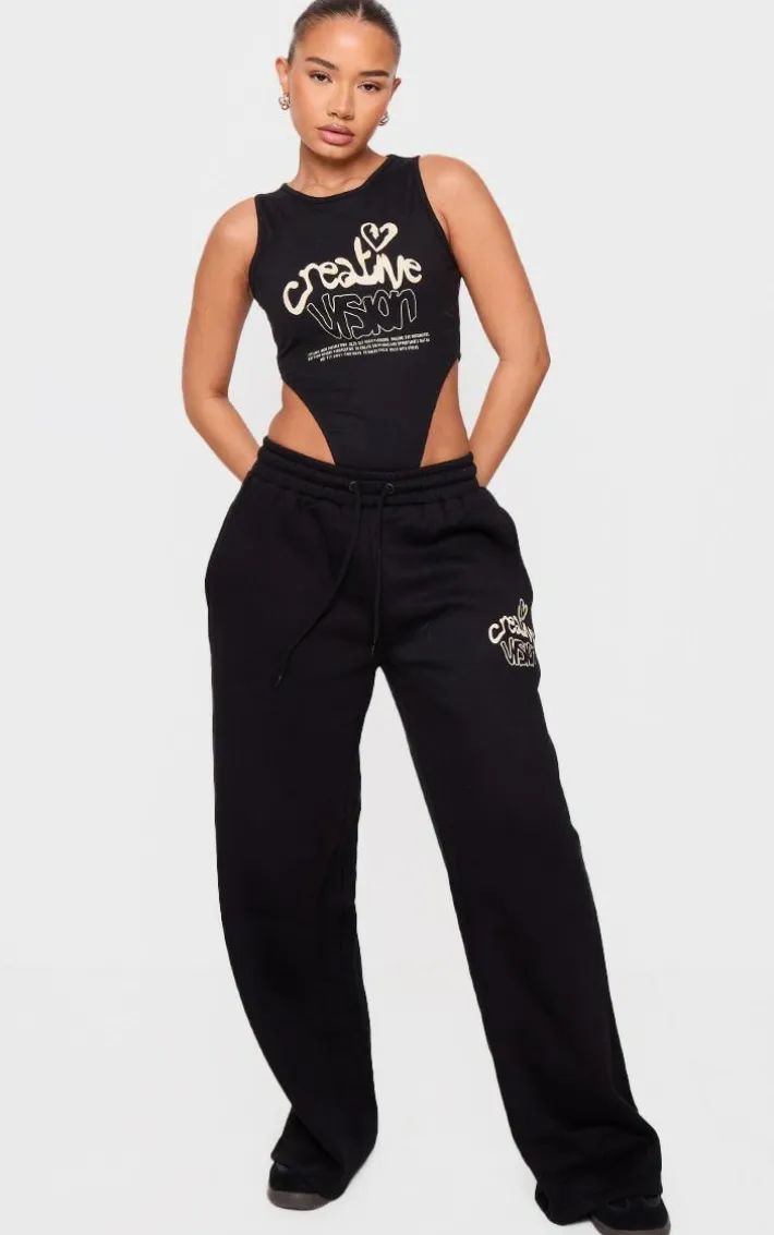 Thus petite black graphic detail high cut bodysuit is calling your name for an elevated finish. Brought to you in a chic black shade, with a graphic detail and high cut design, this bodysuit is sure to give a figure-flattering finish. Style with the matching sweatpants and gold accessories to really make an impact.