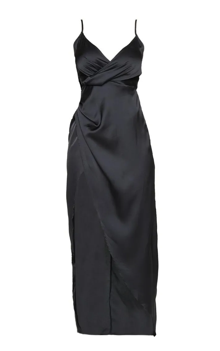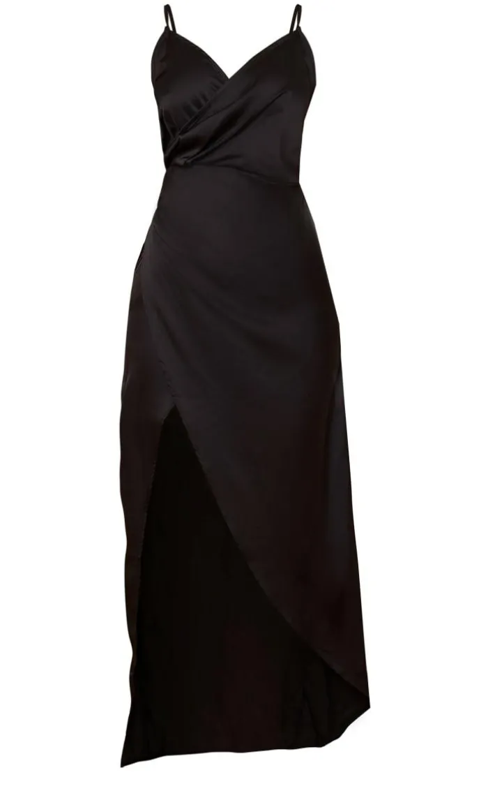 This wrap satin maxi dress is sure to turn heads for all the right reasons. Featuring a black satin material with a wrap detail and a split side, team them with some strappy heels and a mini bag for a look we’re loving.