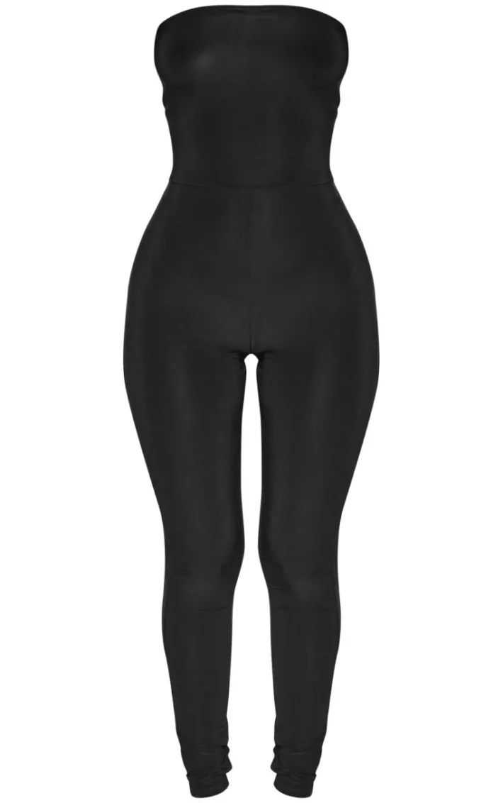 Turn up the heat this weekend with this petite black slinky bandeau jumpsuit. Made from black slinky material with a bandeau neckline and a figure-hugging fit, how could you say no? This petite jumpsuit is everything you have been missing from your weekend plans. Team with knee-high heeled boots, gold accessories and a fierce attitude for a statement finish.
