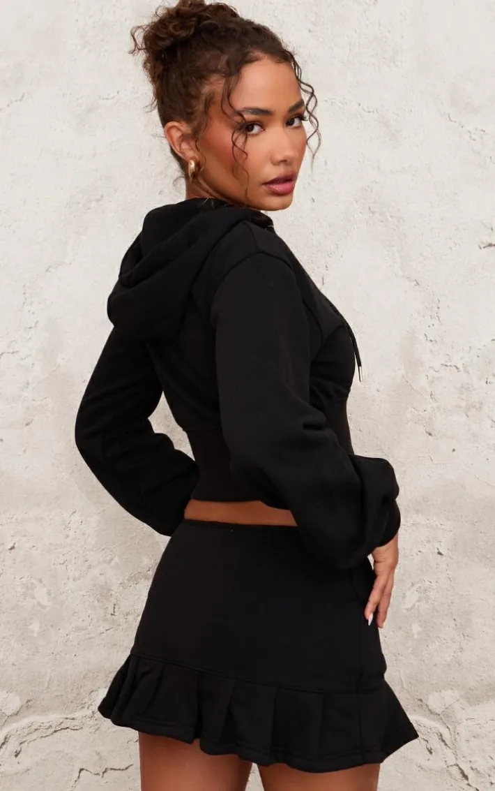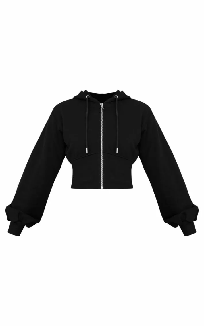 Own the night in this petite black zip up cropped hoodie. Brought to you in a black material with a zip up fastening, you are sure to turn heads and tap into your confident side in this dreamy piece. Its versatile style and cropped length is sure to make you the center of attention no matter what. Style the look with a mini skirt and statement accessories to earn that best dressed title.