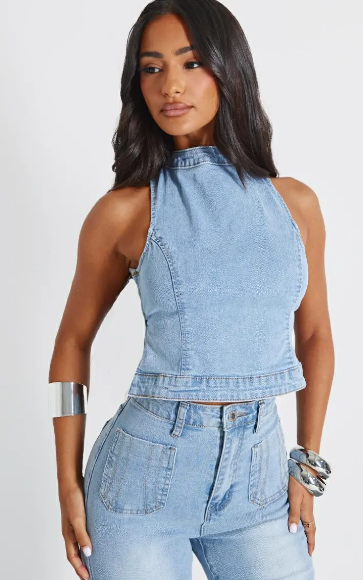 Give your denim look a serious upgrade with this petit bleach wash denim backless top. Brought to you in a bleach wash denim material with a backless design, what more could you want? Team this backless top with the matching flares, heels and gold accessories for a look that is sure to nail the double denim trend.