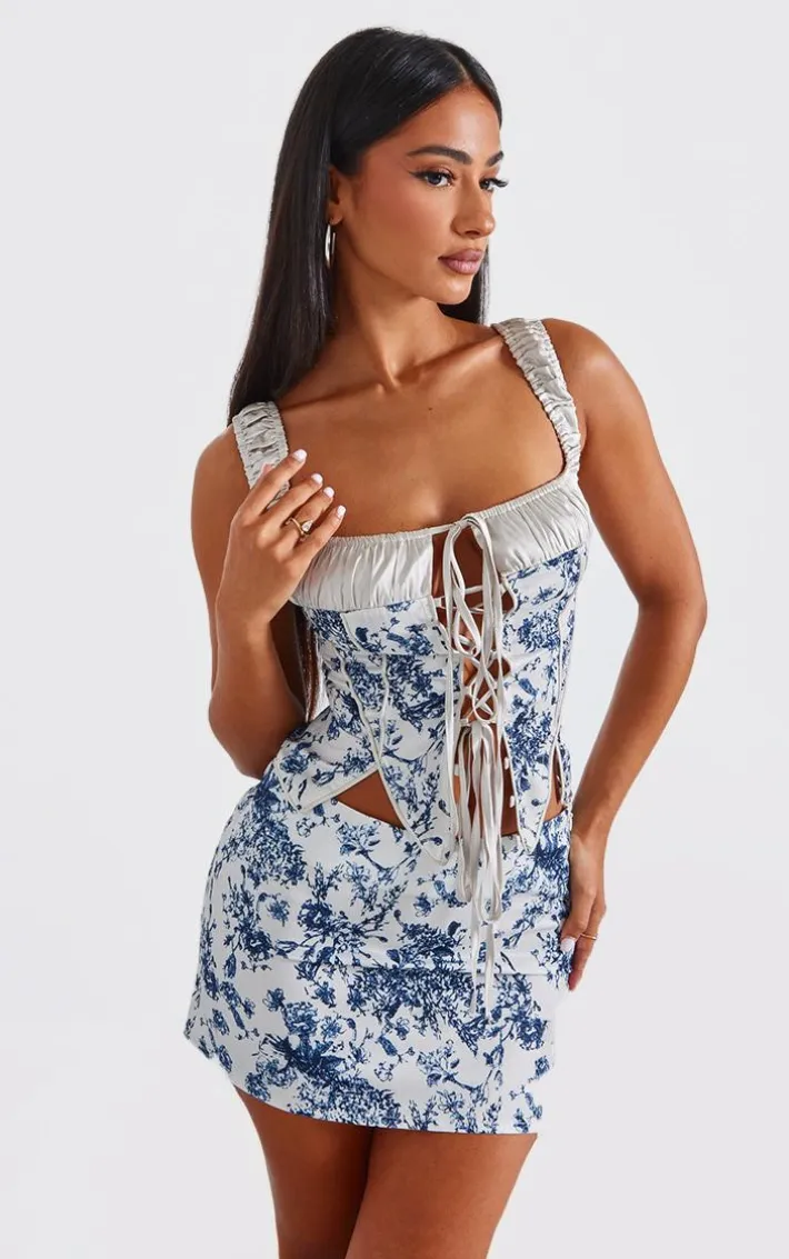 How unreal is this petite blue floral print satin detail corset top? We’re obsessed. Brought to you in a luxe blue floral print design, with a satin material and corset style, you won’t go unnoticed in this. Style with the matching skirt, white heels and silver accessories for a look that will turn heads for all the right reasons.