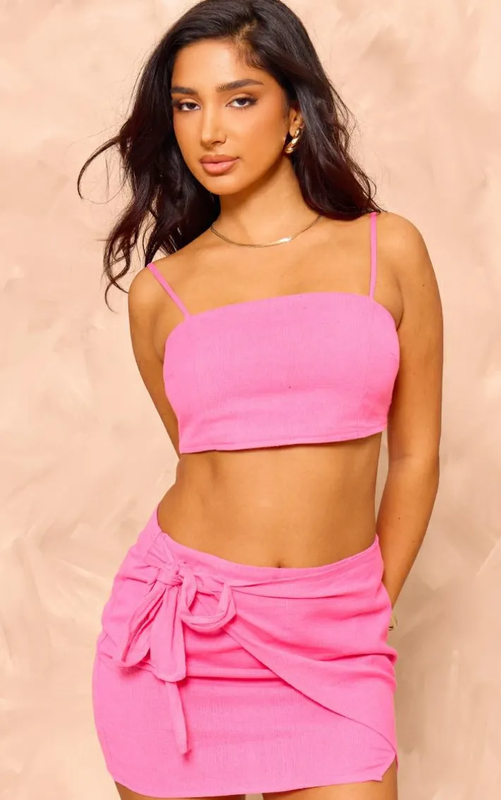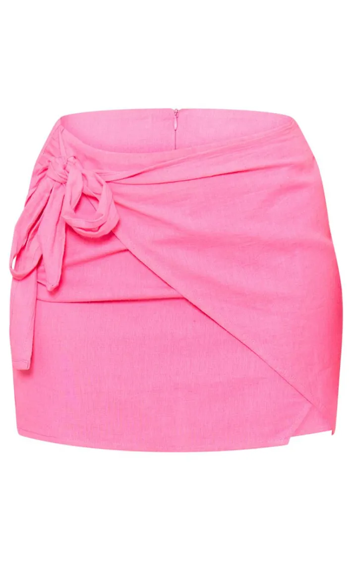 Take on your weekend the right way with this statement petite bright pink linen look wrap around mini skirt. Made from a bright pink linen look material with a wrap around design, this is everything we’re loving and more. it’s figure-hugging fit and mini length is sure to hug you in all the right places. To complete the look style this seamlessly with the matching crop top and some slip on sandals for a look that will secure you all the likes.