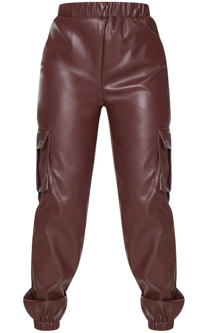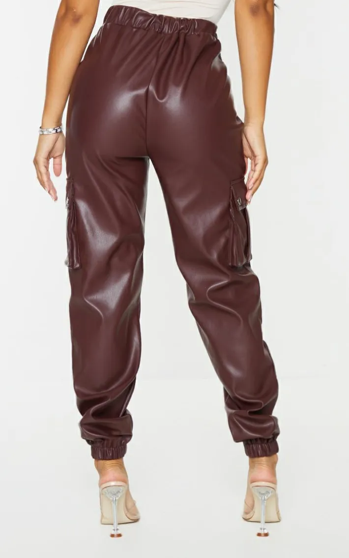 These cargo bottoms are sure to get you noticed. Featuring a chocolate faux leather material with seam detailing and elasticated hems, we are in love. Wear with a white bodysuit and barely-there heels to finish the look.