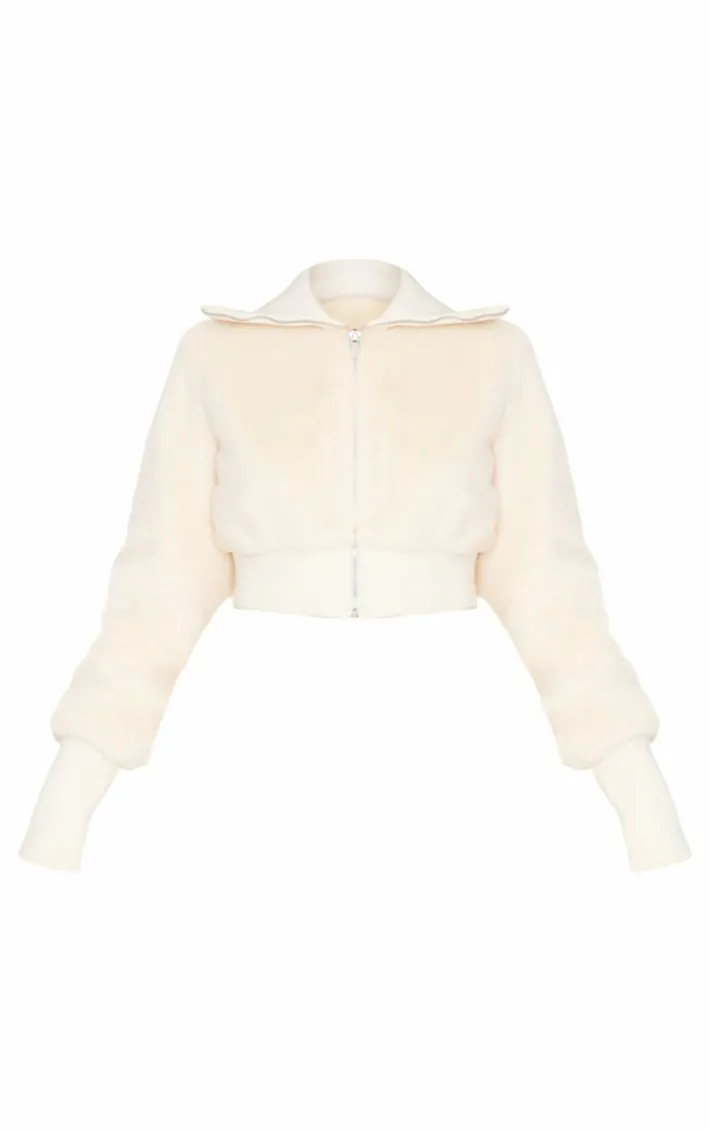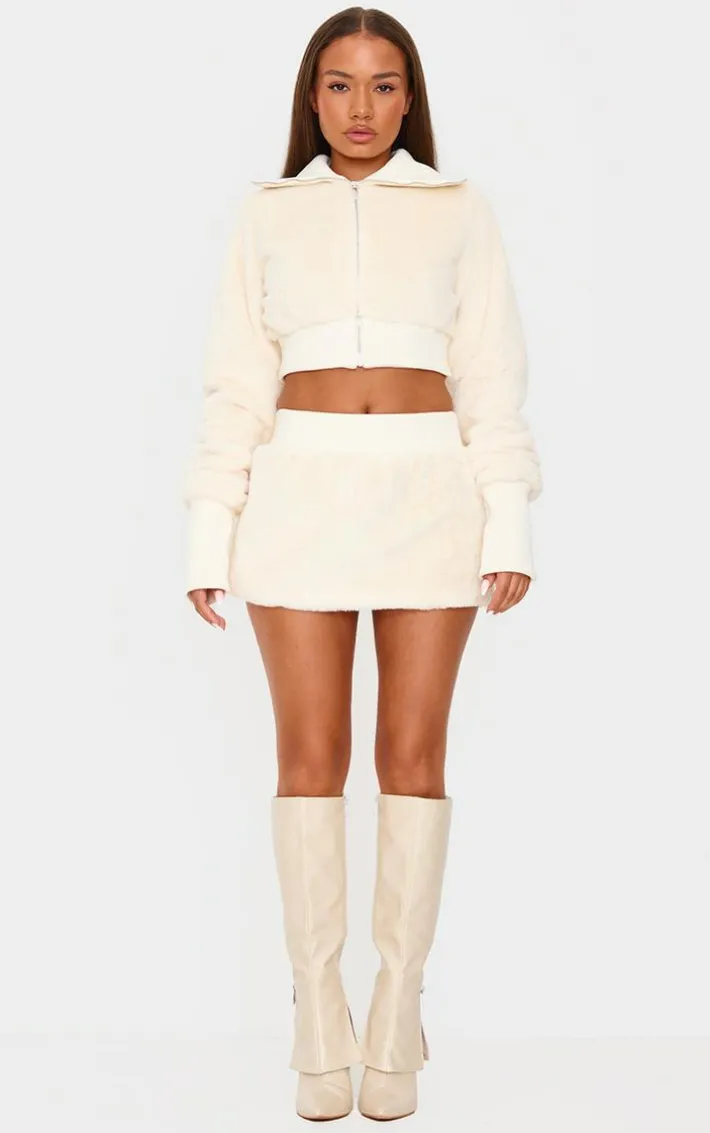 Bring all the cosy feels to your outfit of the day with this petite cream cropped zip up faux fur jacket. Made from a cream faux fur material with a cropped fit and a zip through fastening, what’s not to love? Pair this cream jacket with the matching skirt and knee length boots for a look that is guaranteed to make heads turn.