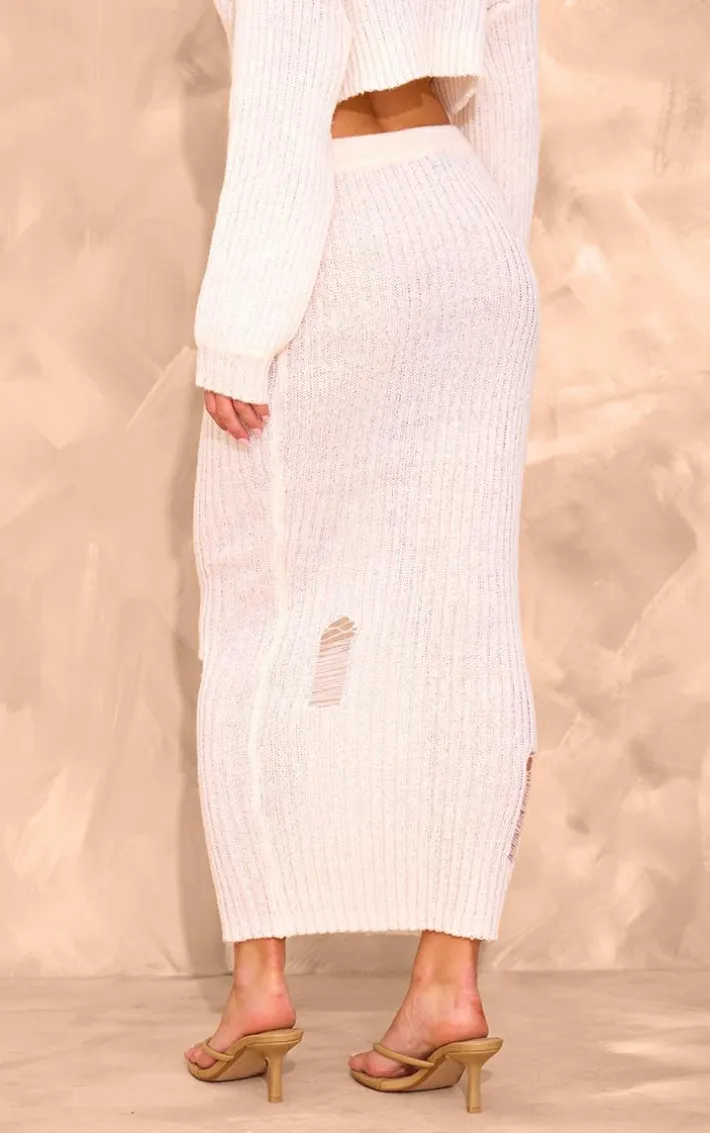 Turn heads this season with this petite cream knitted low waist distressed maxi skirt. Brought to you in a cream knitted material with a low waist fit and distressed design, this maxi skirt is unreal. Style this with the matching top, heels and accessories for a look we’re crushing over.
