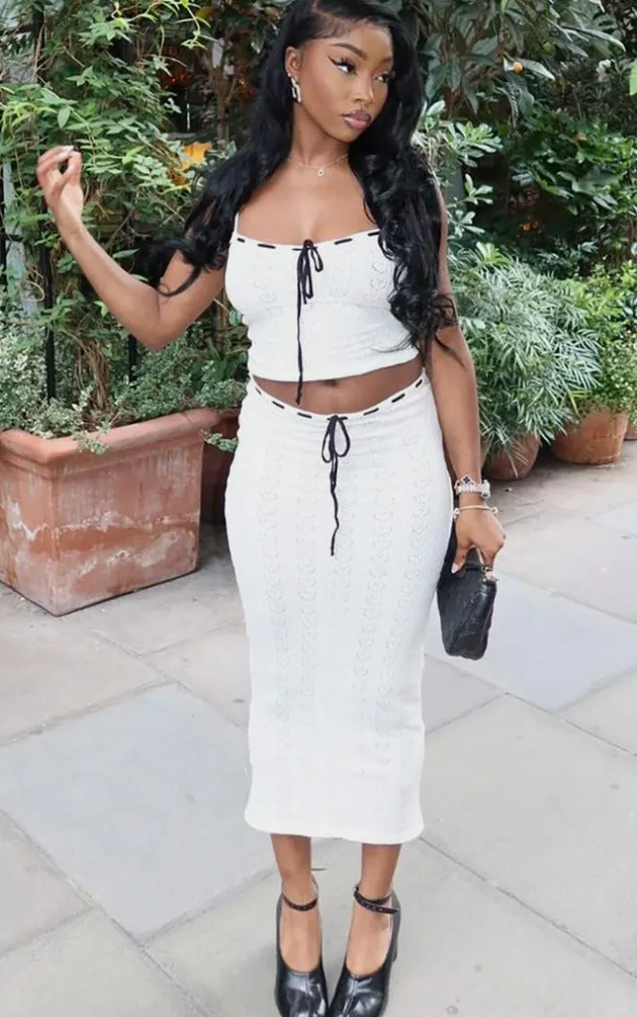 Amp up your style game with this petite cream pointelle knit cami top with contrast trim. Brought to you in a cream hue pointelle knit material with a contrasting trim design, how can you resist? Style this cami top with the matching skirt, flatform sandals and sunglasses for an effortlessly chic look that won’t go unnoticed.