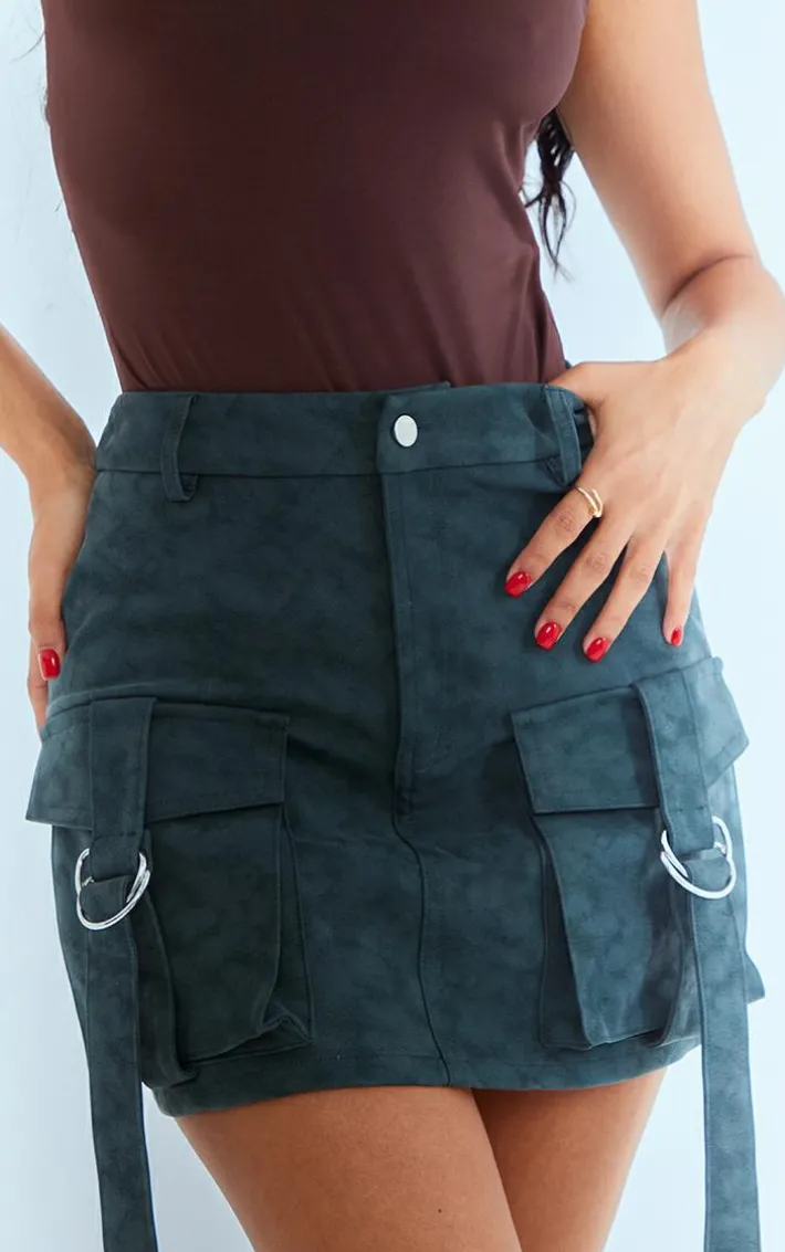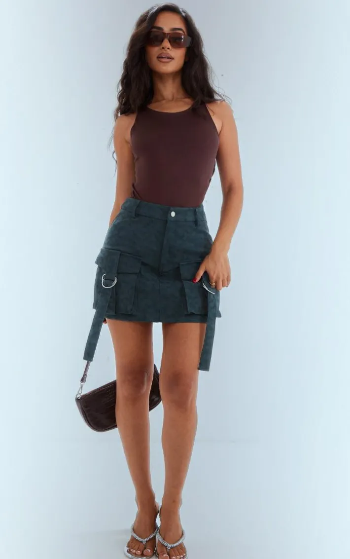 Add some edge to your weekend wardrobe with this petite green washed faux leather pocket cargo mini skirt. This mini skirt is brought to you in a green washed faux leather material with pocket detailing and a cargo style, we can’t get over this. When the weekend calls so does this women’s petite mini skirt. So what are you waiting for? Shop the look and opt for a brown bodysuit, clear high heels and accessories for a look that will have all eyes on you.